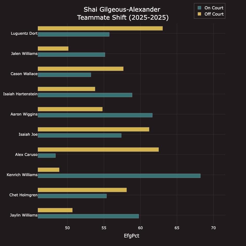 And if you’re looking at his relative value—that is, what might happen if OKC suddenly didn’t have access to that unbelievable production—SGA is also on the deepest roster in the league, surrounded by several strong candidates to make an All-Defensive team. The Thunder outscore opponents by 2.9 points per 100 possessions when Shai is on the bench—for the sake of comparison, Denver’s overall net rating this season is plus-3.6 and ranks ninth—largely because OKC’s defense, when he sits, is still the best in the NBA by a significant amount. Several of SGA’s teammates also have a higher effective field goal percentage when he’s off the court, which isn’t an indictment of his game so much as praise for the talent around him.