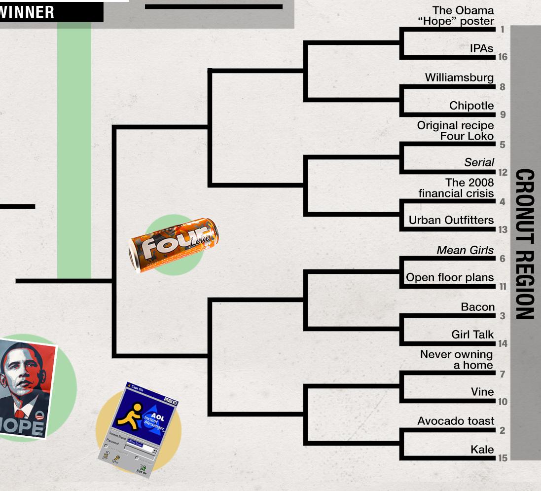 In an effort to pin down exactly what the millennial experience was, we gathered as many generational artifacts as we could—people, places, music, movies, and TV shows, but also objects, trends, and behavioral tics—then narrowed them down to the most essential and threw them into this bracket. This was a herculean task, and difficult decisions had to be made (for a full accounting of our crop of submissions, check this out). We also had to make definitive determinations about many things with blurry distinctions, two in particular: whether something belonged more to the ’90s than to millennials (e.g., The Simpsons) and whether to include things that arose during the heyday of millennials but then grew to transcend generational classifications. You will not see Taylor Swift in this bracket, so there’s your answer on where we came down on that particular conundrum.
