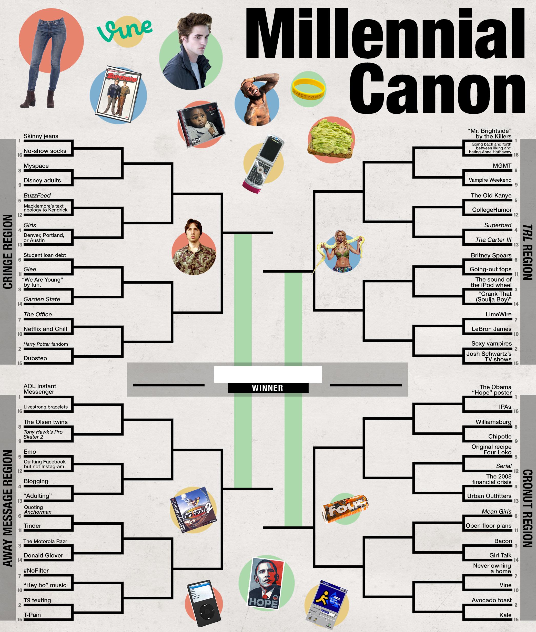 Editor's note: The first-round polls have closed. See the ultimate winner here! In the meantime, check out the millennial cringe canon, all the submissions we received for the Millennial Canon Bracket, and Brian Phillips's think piece on millennial contradiction.
