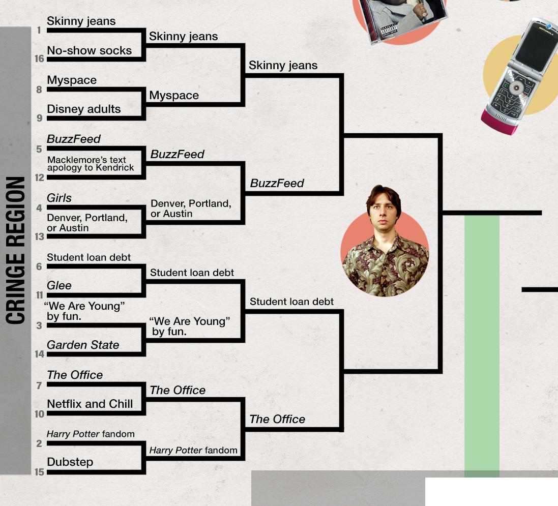So now it’s big dogs only. The most iconic artifacts of a generation are going head-to-head. The Obama “Hope” poster versus the 2008 financial crisis, a core millennial clash if there ever was one; the sound of the iPod wheel versus LimeWire; skinny jeans versus BuzzFeed. Praise the Knights of Columbus, the Sweet 16 is here.