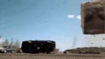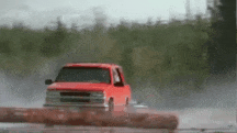 The most challenging stunt involved Kimberly’s red Chevy Tahoe, which needed to hit an errant log from the side, flip over it, and roll down the highway. Similar to the blue Mustang stunt, Hice assembled the SUV with an air cannon to initiate its roll.
