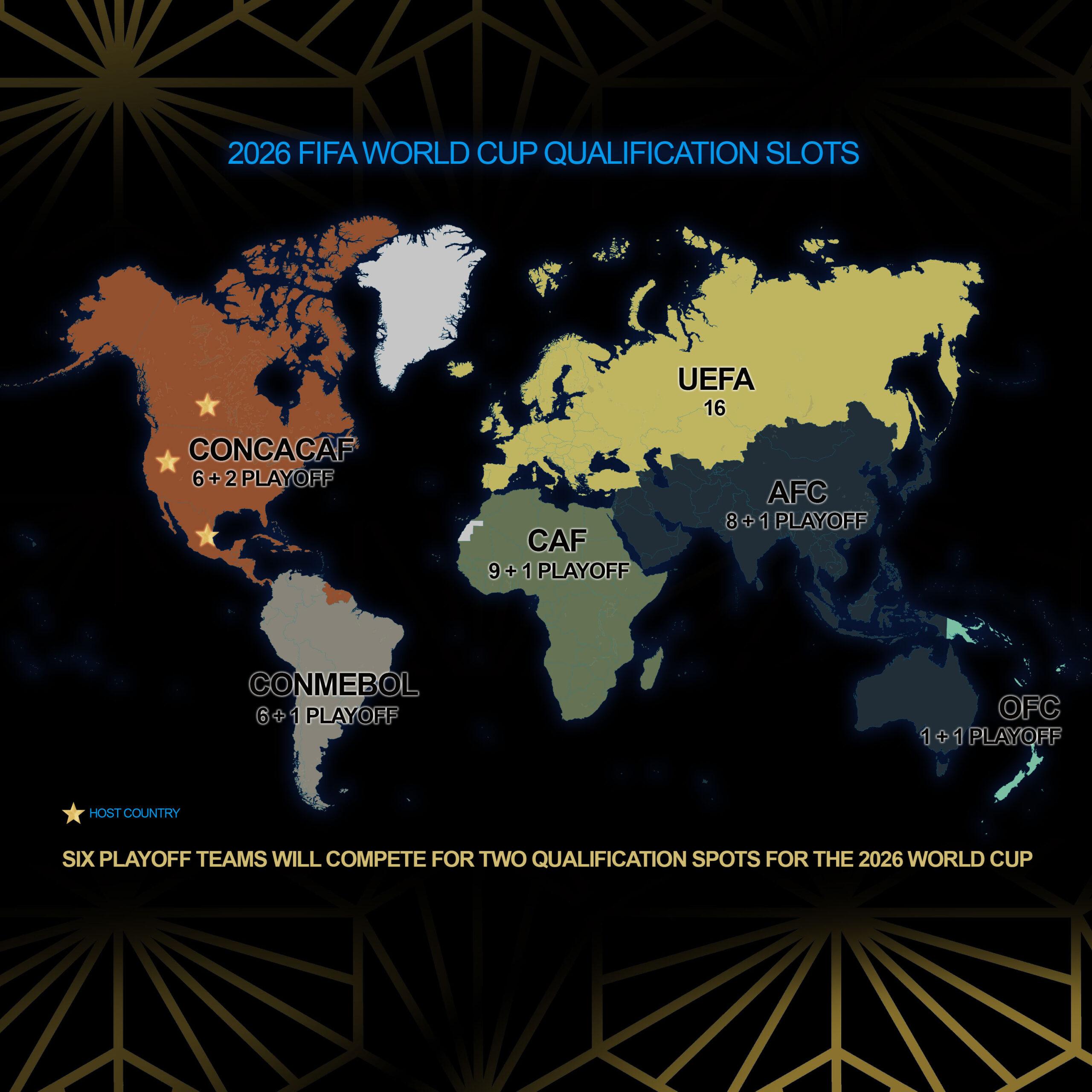 Here are the continental breakdowns for qualifying, which is already well underway. Thirteen teams have clinched their qualification so far, including the three host nations of Canada, Mexico, and the United States.