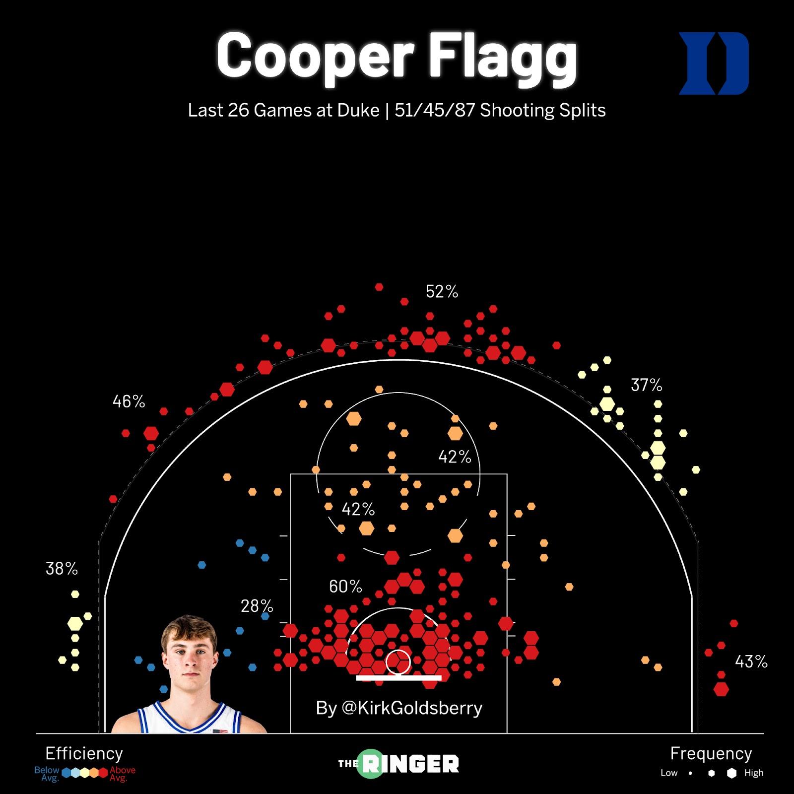 As a scorer, Flagg averaged 1.07 points per shot at Duke, which is a solid number fueled by above-average efficiency at the rim and strong jump shooting. But when NBA teams scout prospects, they don’t just look at aggregate stats for a whole season. Buried deep in Flagg’s college stats is a powerful finding: As he matured throughout the season, Flagg’s shooting numbers went from good to great.