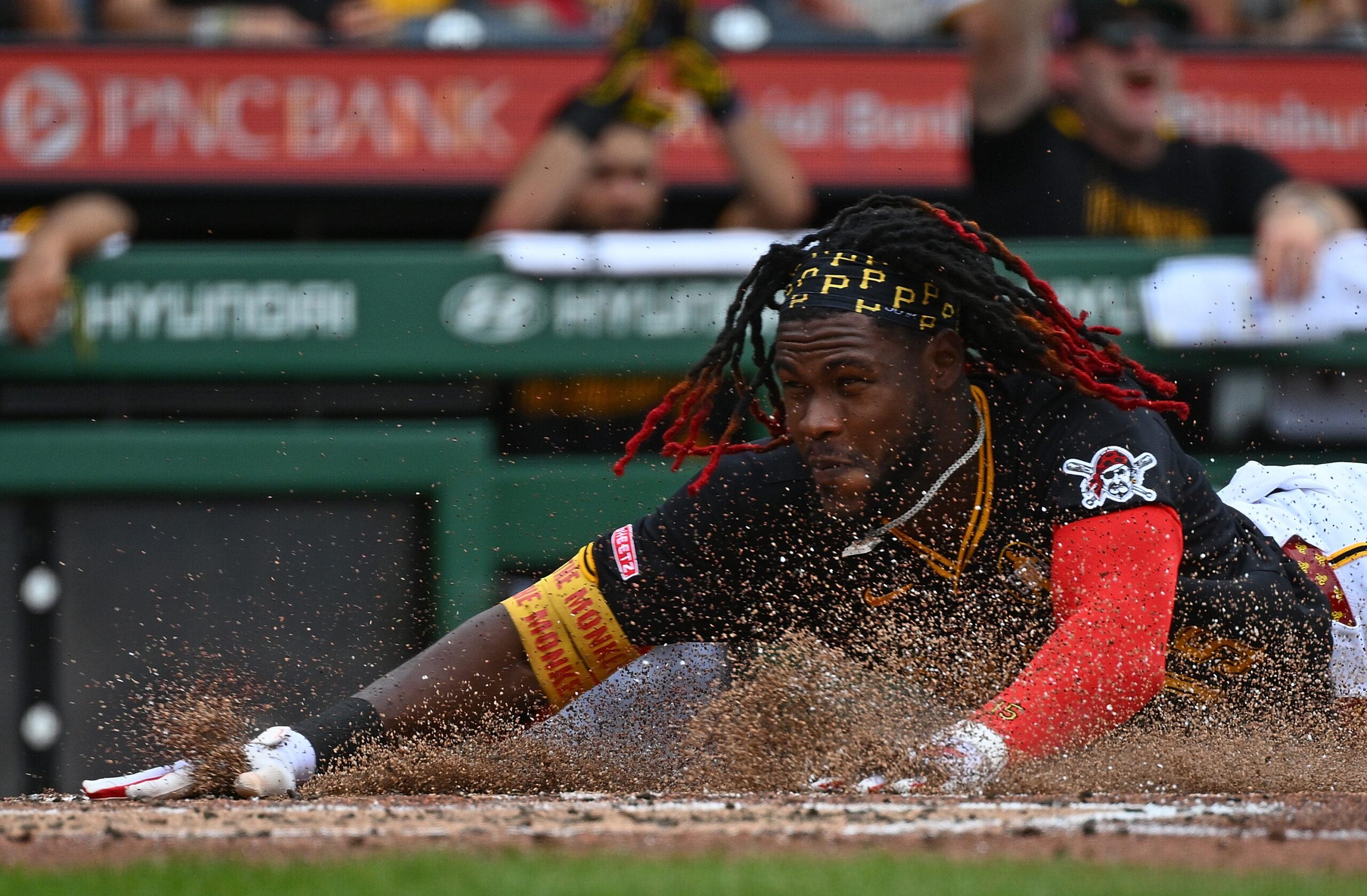 Oneil Cruz slides in safely to score a run during a game against the Diamondbacks on July 27