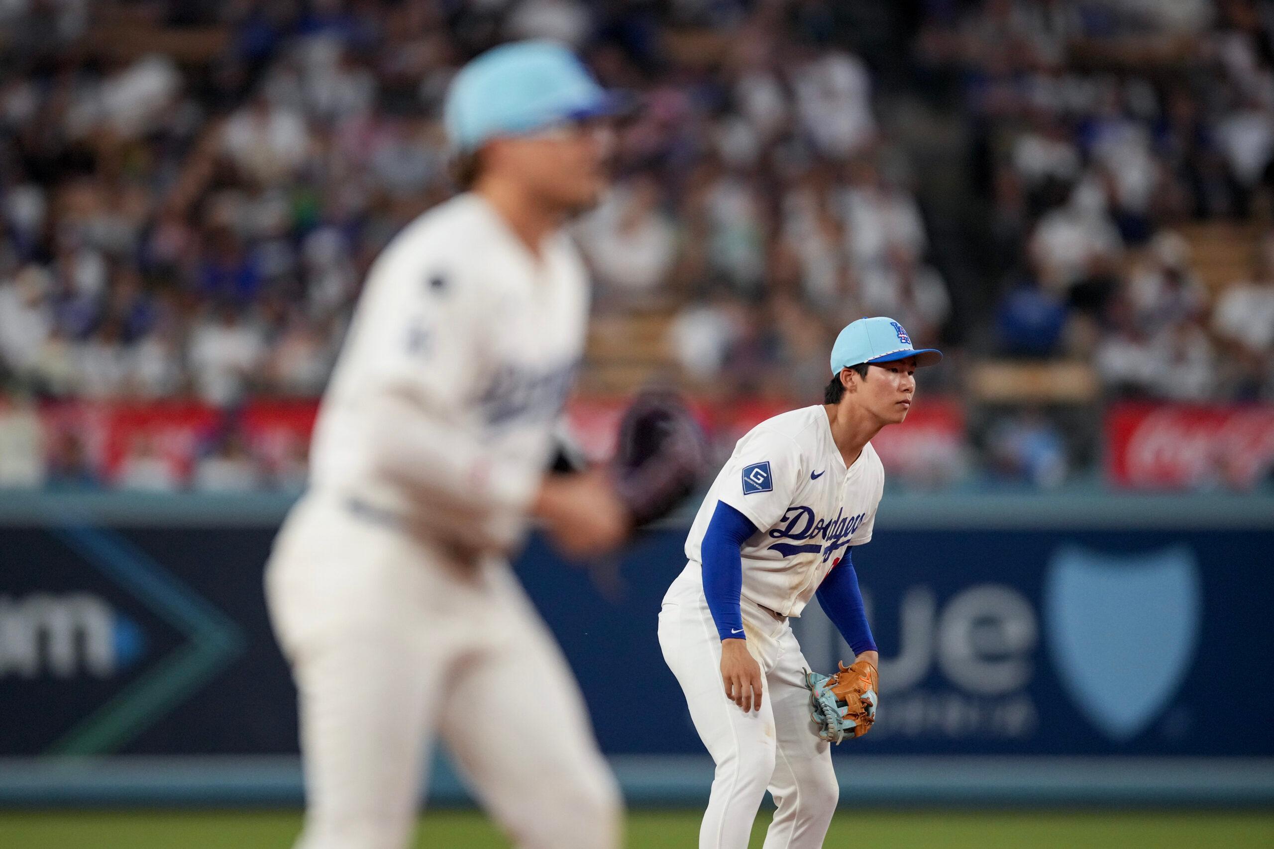 Kike Hernandez and Hyeseong Kim during the game against the Houston Astros on July 4