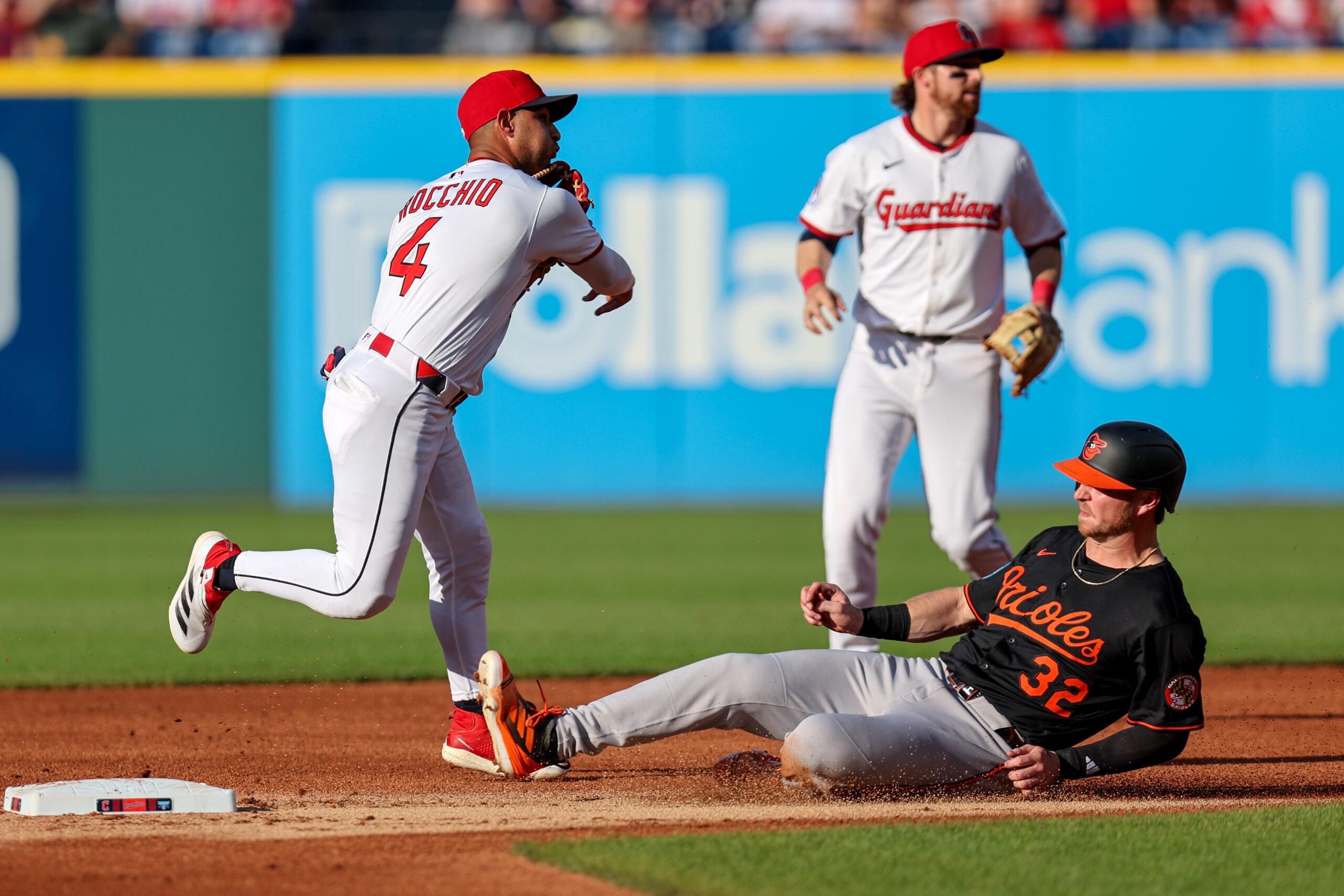 Guardians shortstop Brayan Rocchio forces out Orioles first baseman Ryan O’Hearn at second base on July 23