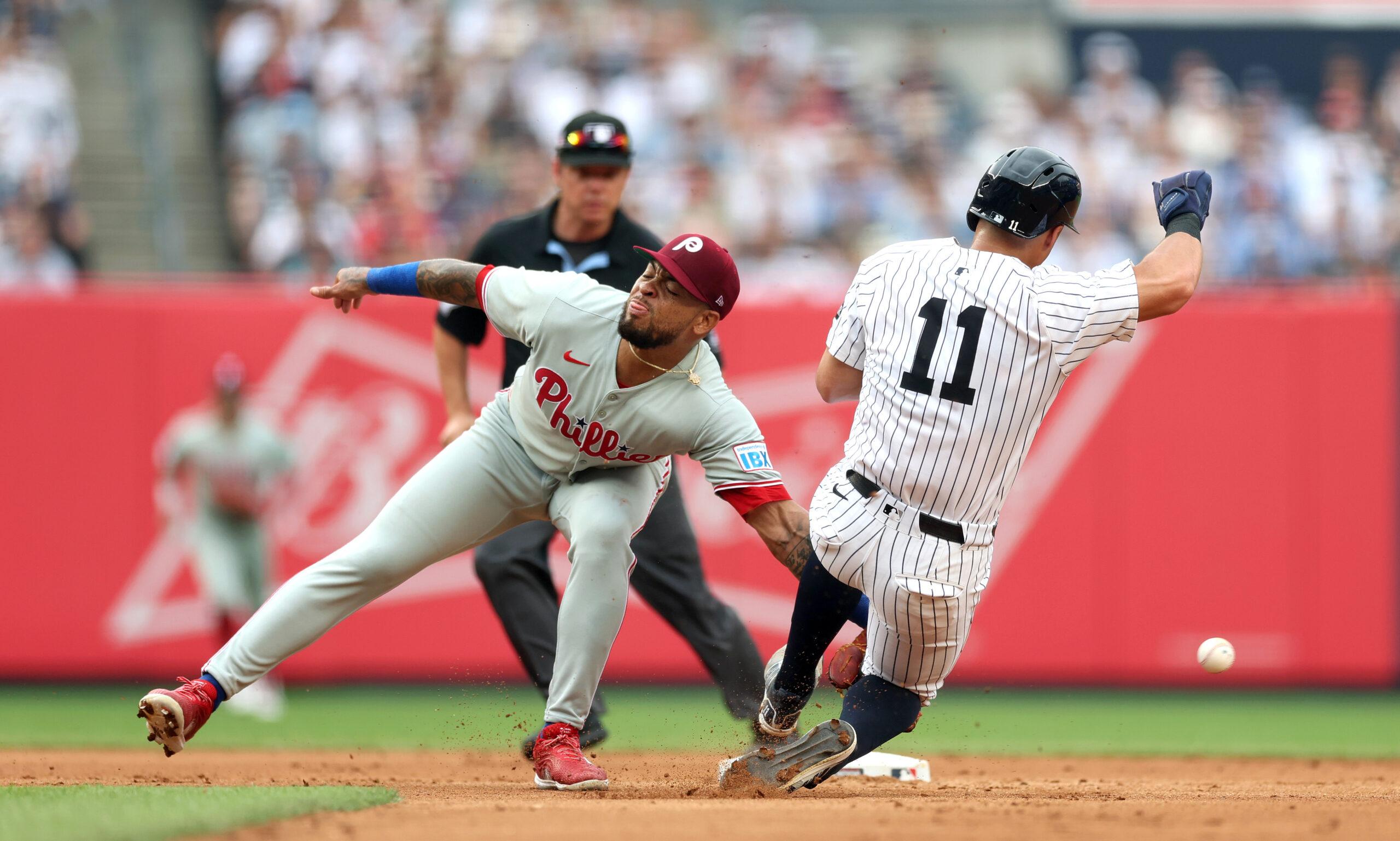 Anthony Volpe of the Yankees slides into second base past Edmundo Sosa of the Phillies on July 27