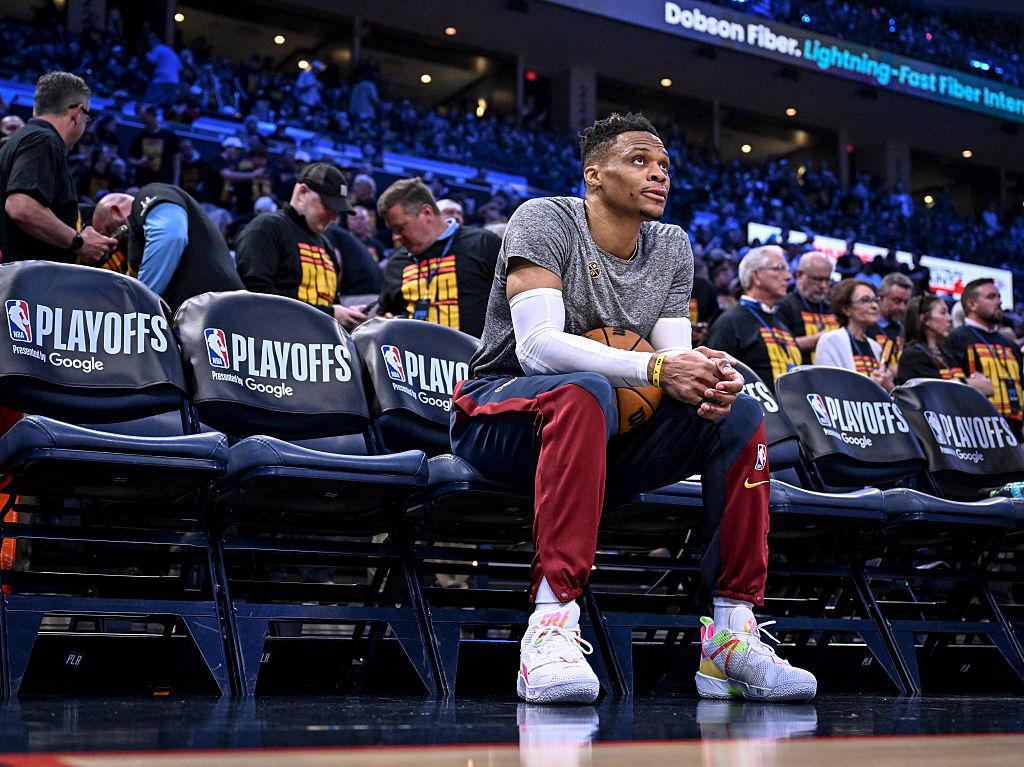 Russell Westbrook on the bench before a playoff game against the Oklahoma City Thunder
