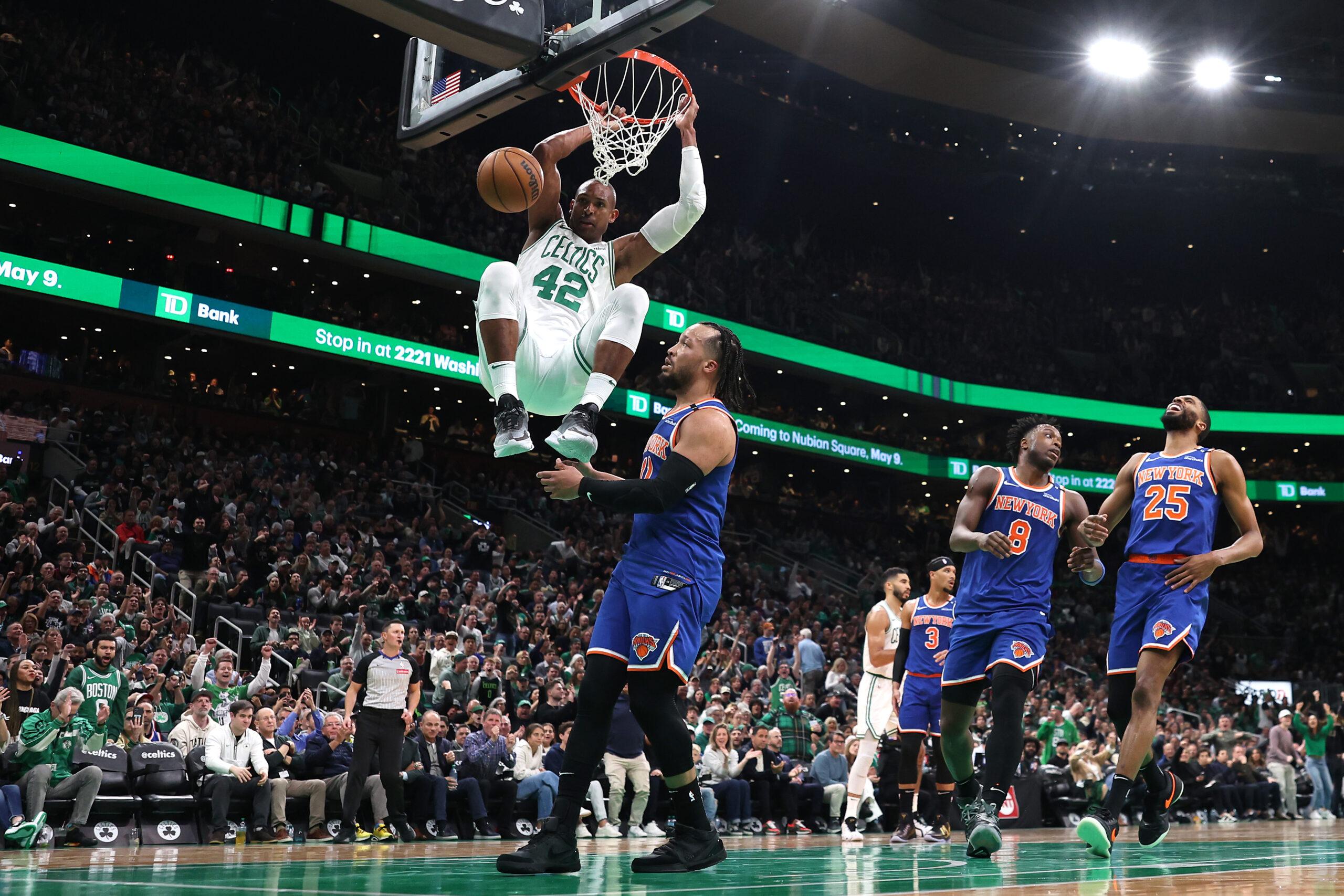 Al Horford dunks the ball against Jalen Brunson in the 2025 NBA playoffs