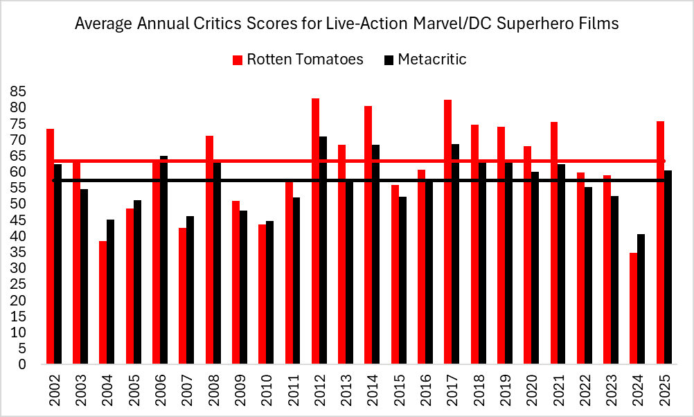 The good news for those suffering from superhero fatigue fatigue is that this quartet—well, the last three releases, really, because Brave New World seemed to deepen the death spiral—has pulled off a collective creative rebound. The chart below shows the average Rotten Tomatoes and Metacritic critics scores for live-action DC and Marvel movies (as classified by Metacritic) dating back to 2002—a pool of 102 movies, or an average of 4.25 per year. The horizontal lines indicate the average ratings over the 24-year period.