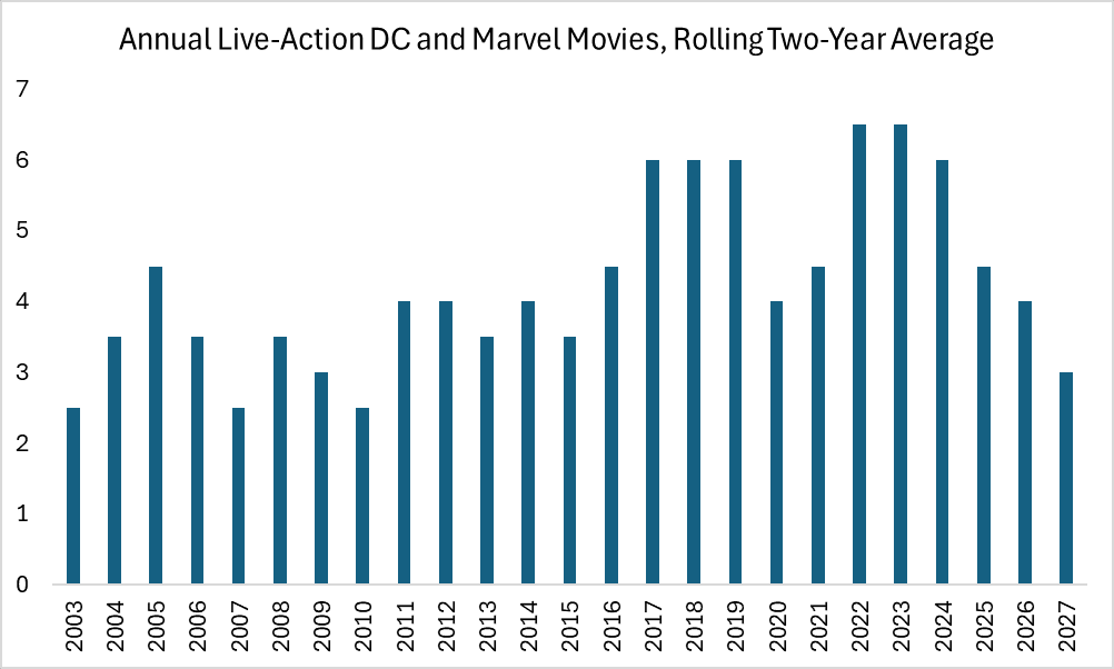 On the small screen, results remain highly variable: This year’s Marvel offerings have ranged from Ironheart (whose reviews were, in Metacritic terms, “mixed or average”) to Daredevil: Born Again (“generally favorable”) to Your Friendly Neighborhood Spider-Man (generally, um, more favorable). There are three more Marvel series to come this year, plus DC’s second season of Peacemaker—which will be followed next year by the highly anticipated Lanterns. All in all, though, the superhero assembly lines have slowed, as the movie release calendar shows. The chart below displays a rolling two-year average of the number of live-action DC and Marvel movies released each year, extrapolated to include the four confirmed qualifying films for 2026, plus the two for 2027 (which could be postponed or supplemented).