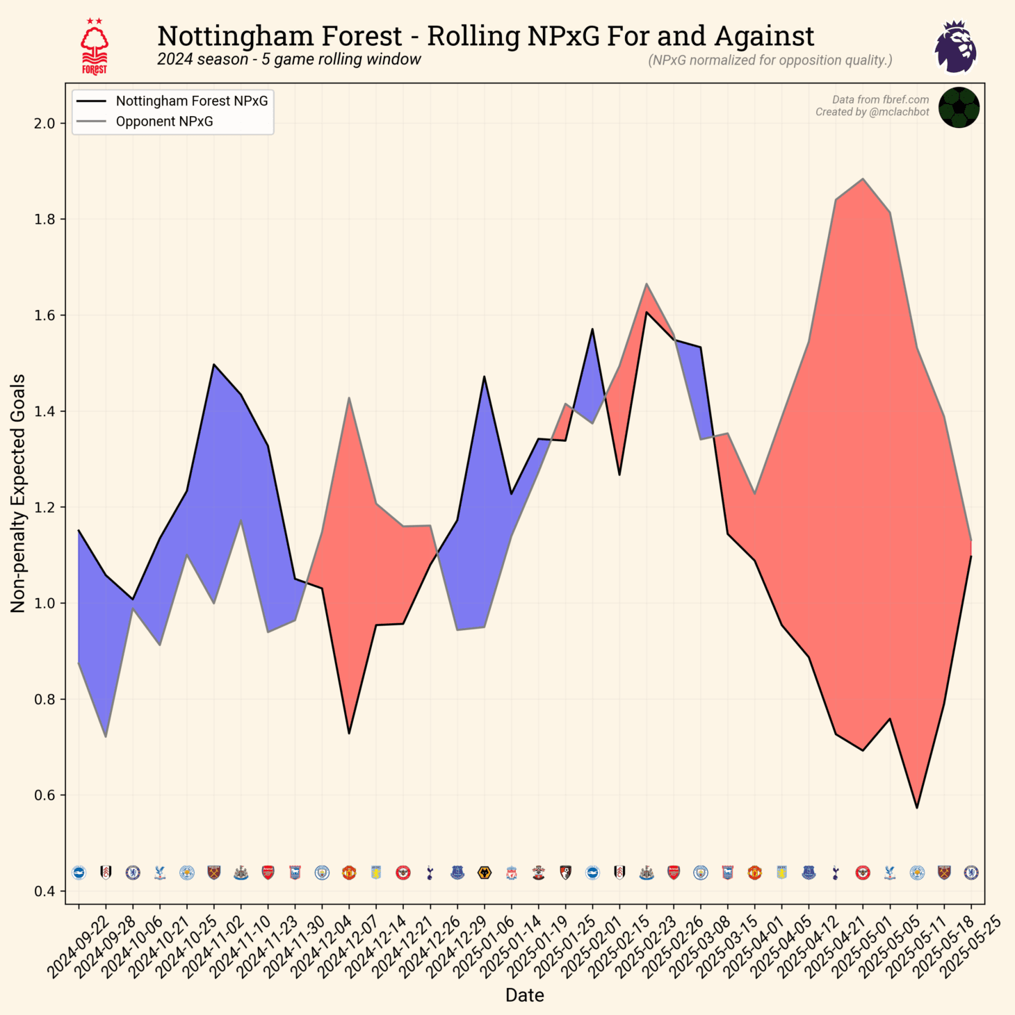 The chart below depicts the five-game rolling expected goal difference for Nottingham Forest last season. After a stellar first half of the campaign (they were third in the table on New Year’s Day), Forest fell off considerably, finishing 16th in second-half expected points. By the end of the season, Nottingham was playing like one of the bottom five teams in the Premier League.