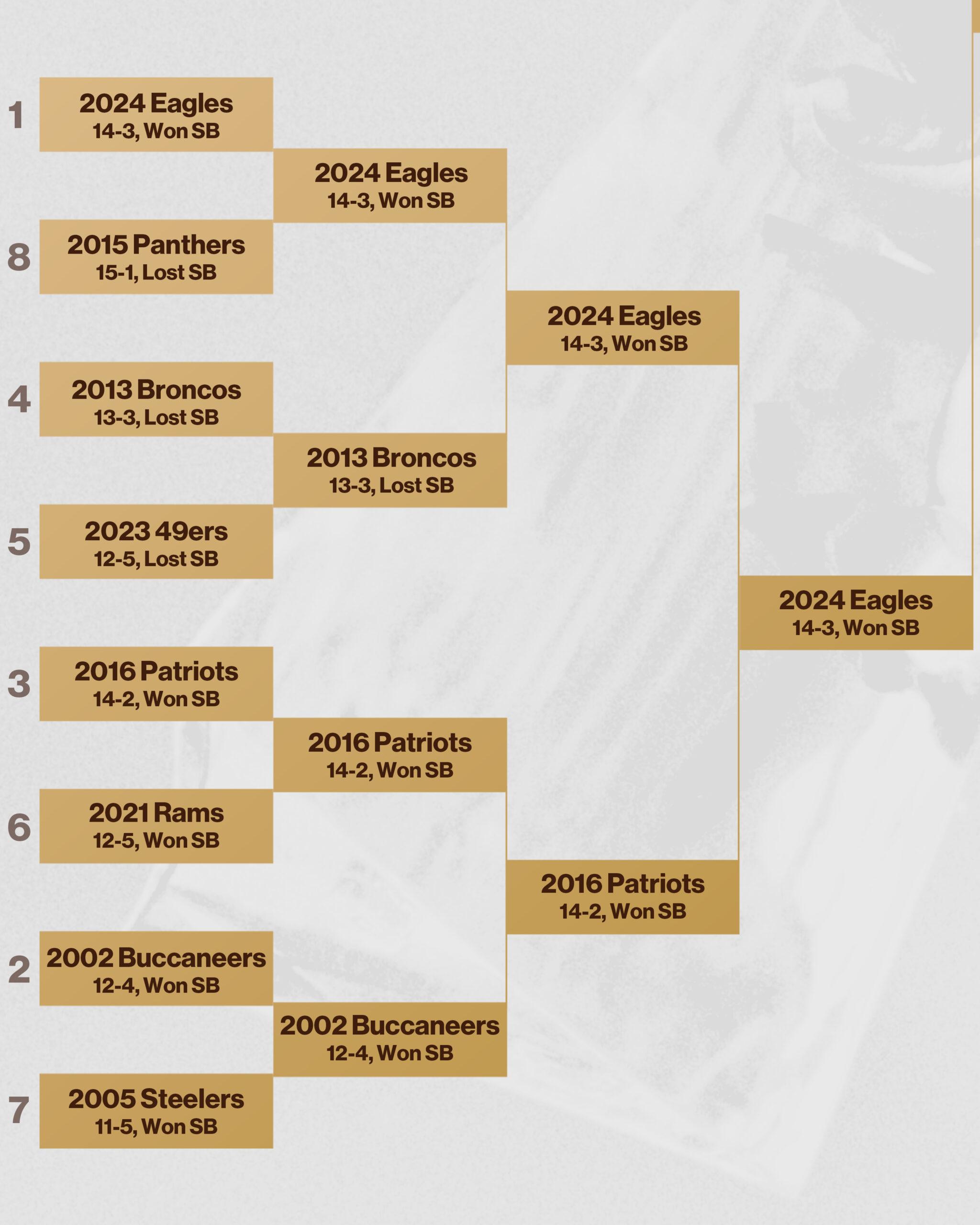 Overall, the Eagles outscored their opponents by 68 points in the playoffs—the third-best differential of any Super Bowl team this century. From a roster talent standpoint, there aren’t too many teams on this list that stack up to the 2024 Eagles. Howie Roseman built a juggernaut, and when things clicked, it seemed like this team was unbeatable. —Sheil Kapadia