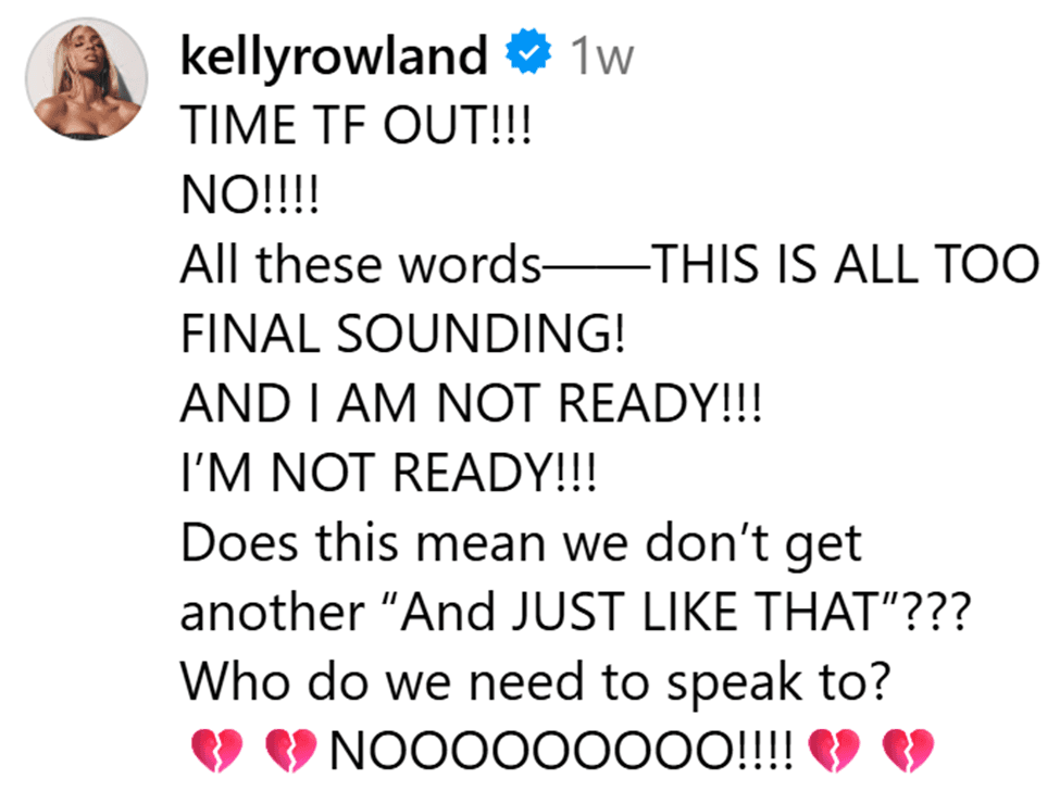 Lindbergh: A last Sex and the City supper was certainly in order. Kelly Rowland—who knows a thing or two about being part of a three-member girl group—spoke for … well, some of us in her comment on SJP’s poetic (?) Instagram goodbye to Carrie: