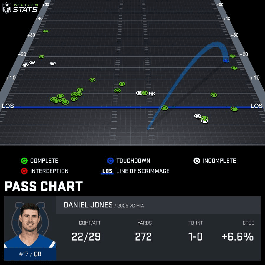We could have a possible Sam Darnold situation brewing in Indianapolis, where Daniel Jones led the Colts to a 33-8 beatdown of the Dolphins on Sunday. Jones completed 22 of 29 passes for 272 yards (an impressive 9.7 yards per attempt) and a touchdown. Jones also ran for 26 yards and looked fast for the first time since his 2022 season with the Giants. The confidence in his deep ball also seemed to be back, as he connected on a handful of downfield throws.