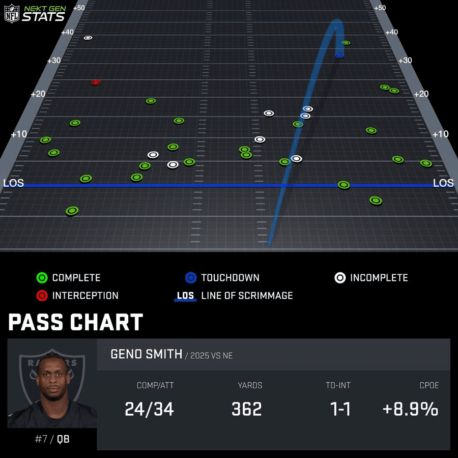 It was a thorough performance that showed why the Raiders were excited to send a third-round pick to Seattle for Smith. He operated the offense well, threw the ball accurately, and capitalized whenever New England’s defense made a mistake in coverage. Smith played winning football.