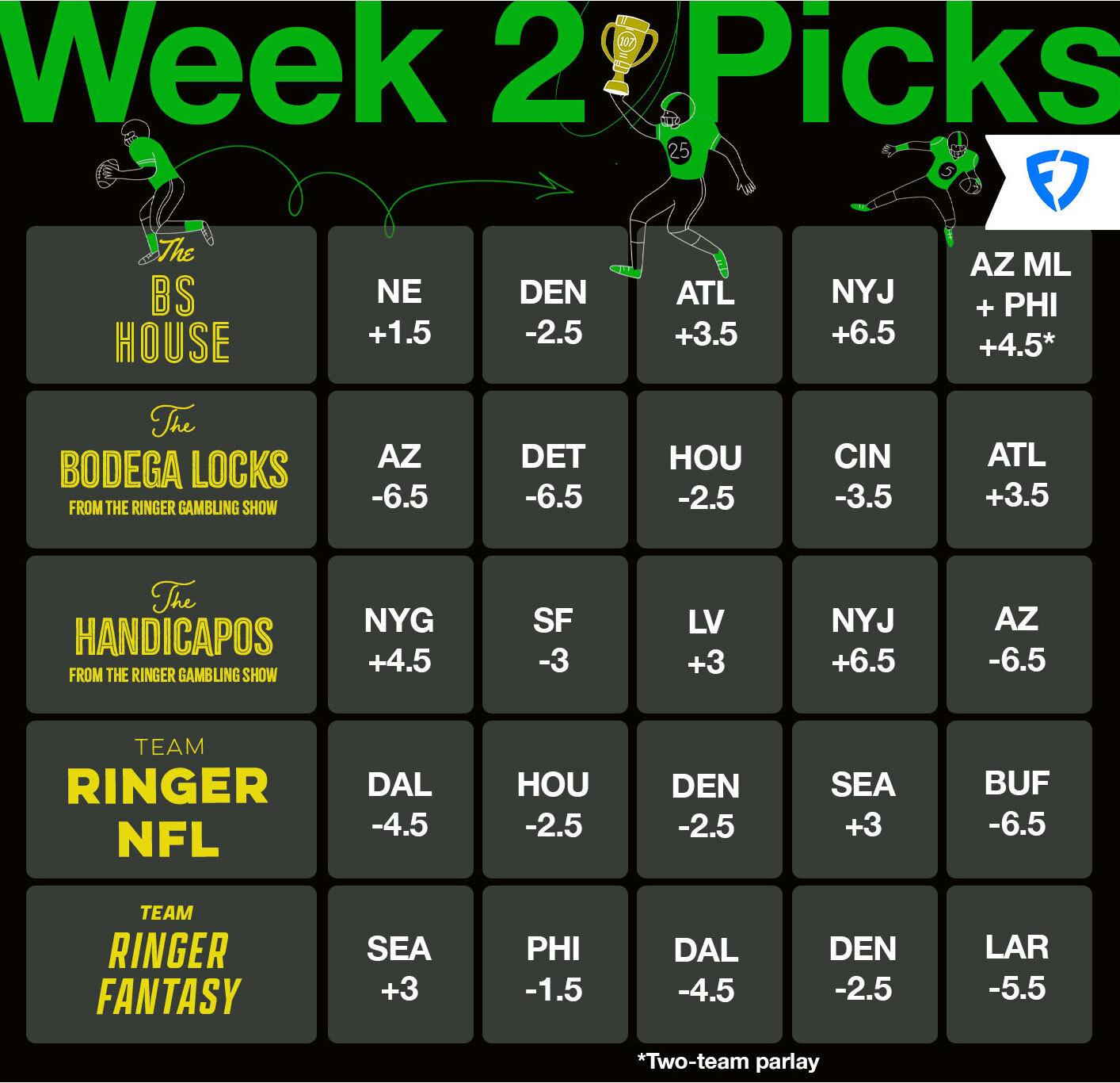 This NFL season, Bill Simmons is inviting a collection of Ringer podcasts to enter the oddsmaker’s octagon with him—and only one will emerge victorious. For the entire regular season plus the playoffs (for a total of, you guessed it, 107 picks), The Bill Simmons Show will square off against The Ringer NFL Show, The Ringer Fantasy Football Show, and two teams from The Ringer Gambling Show. We’ll announce picks every Friday at theringer107.com and on our social platforms, and then we’ll publish an updated leaderboard on Tuesday. May the best (worst?) degenerate win. All odds via FanDuel sportsbook.