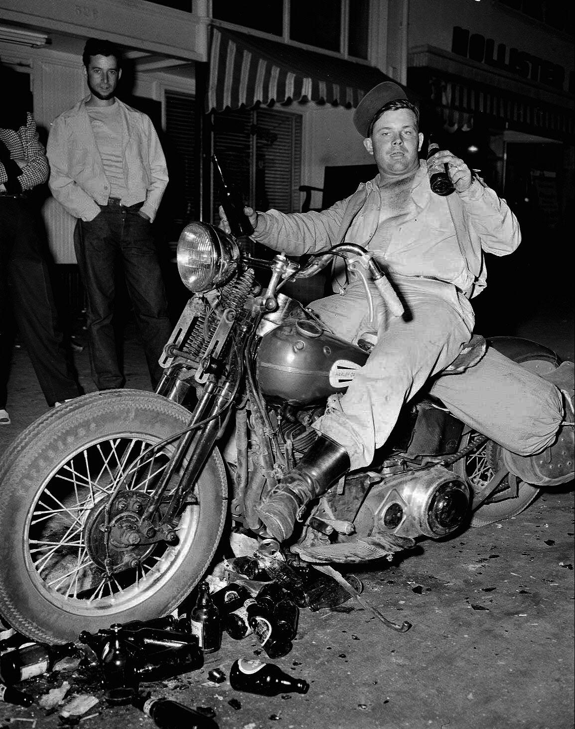 With a leading man in Marlon Brando, the 1953 movie The Wild One turned the miscreant biker into a bona fide mythical figure. The movie was inspired by the Hollister rally, and it gave life to the idea of the motorcyclist as the family man’s worst nightmare (and his daughter’s forbidden fantasy). When asked what he was rebelling against, Brando’s Johnny Strabler just said, “Whaddaya got?”—the ultimate credo of the nihilist biker who had no MO except to ride around and destroy whatever got in his way. (In 1966’s The Wild Angels, Peter Fonda expanded on that creed before, naturally, trashing a church and killing a preacher: “We wanna be free. We wanna be free to do what we wanna do, … and we wanna get loaded, and we wanna have a good time. That's what we're gonna do. We're gonna have a good time. We're gonna have a party!”) Reviews of The Wild One bought into the fearmongering: “[The Wild One] is a frightening picture … that revolves around conflict between young, seemingly hopped-up ruffians and the mob lynch law spirit of the community’s staid, respectable citizens, with the police helplessly standing by.”
