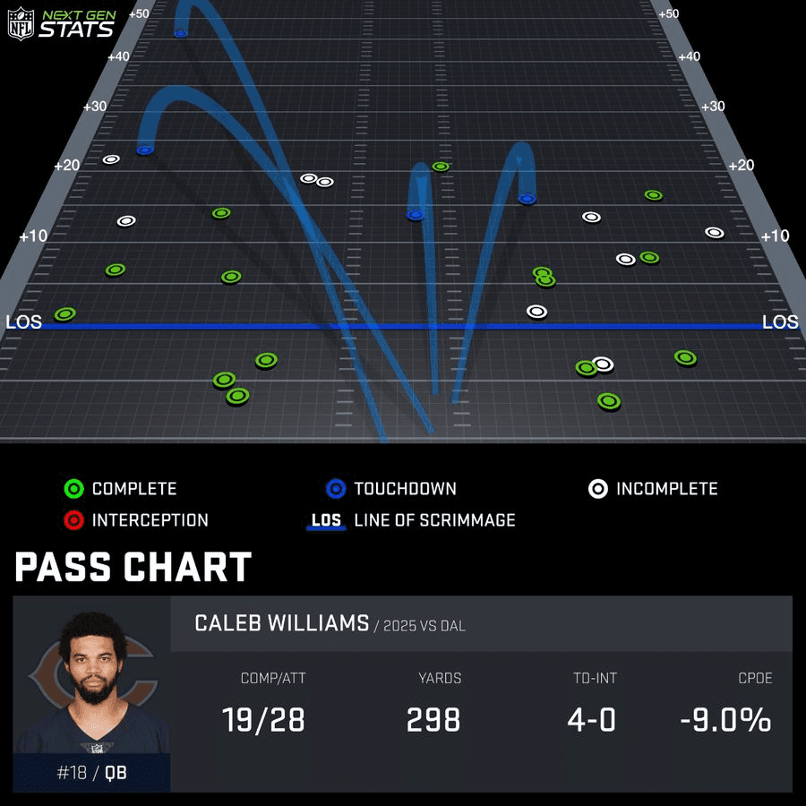 By the end of Chicago’s 31-14 win over the Cowboys, Williams was tied with Aaron Rodgers for the most passing touchdowns in the NFL this season. He ranks in the top 10 in both yards and EPA per dropback. He leads all second-year quarterbacks in PFF’s passing grade and ranks ninth overall. There are still plenty of concerns about the Bears offense—with the ground game at the top of the list after Chicago’s running backs mustered just 49 yards in Sunday’s win—but, for the first time in a long time, the play of the quarterback isn’t chief among them.