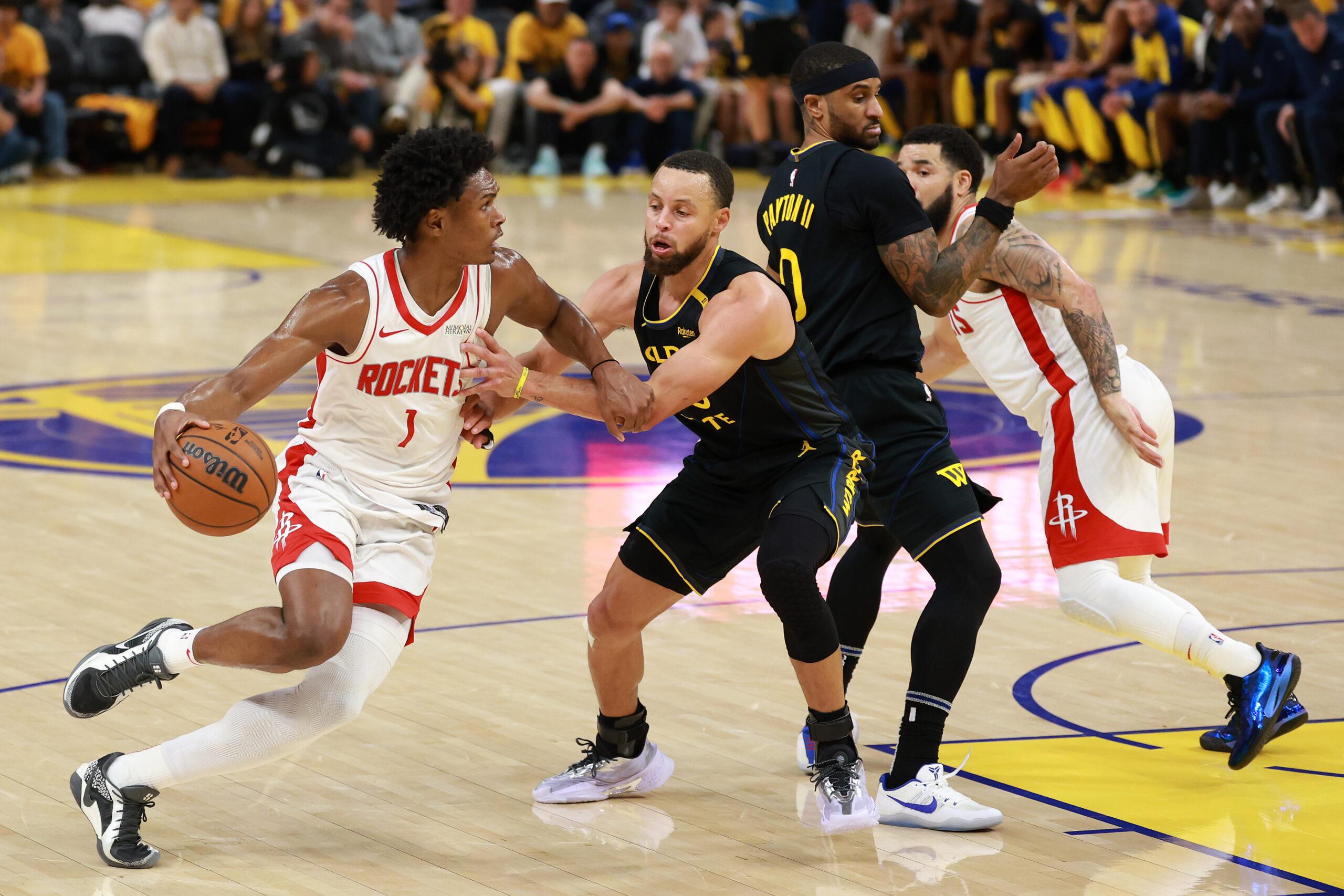 Amen Thompson drives to the basket against Stephen Curry