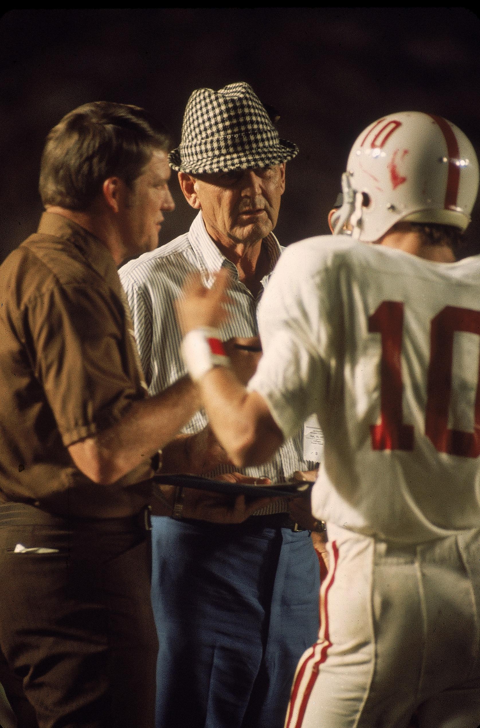 Paul Bear Bryant on the sideline with QB Terry Davis during the Alabama game against USC on September 10, 1971