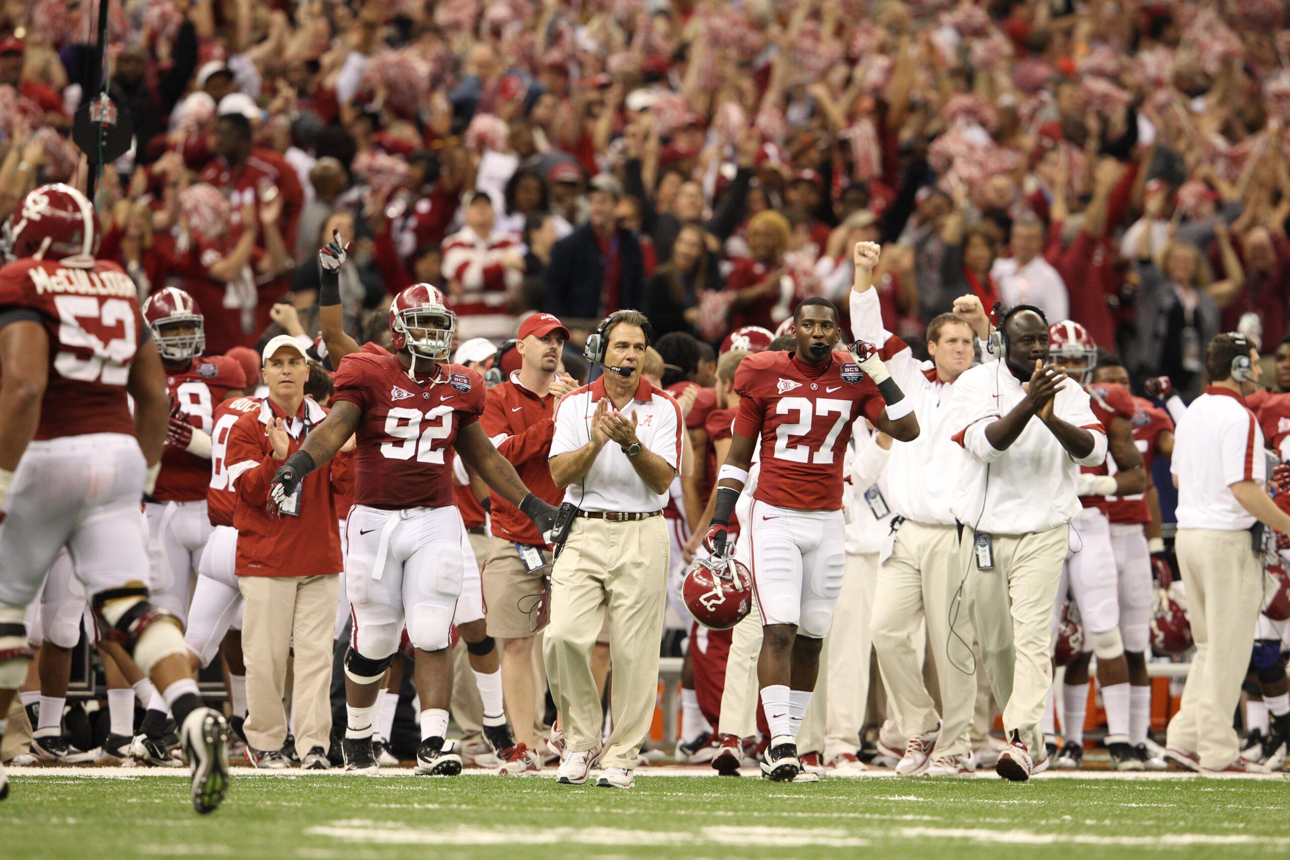Saban watches from the sideline during the 2012 national championship game against LSU