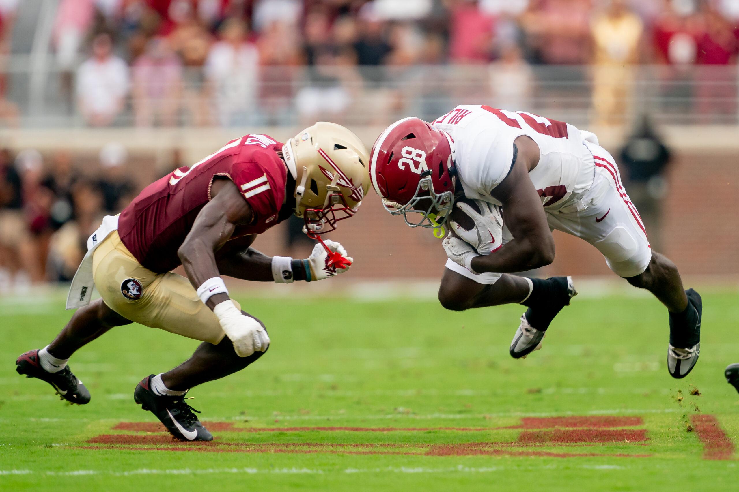 Florida State defensive back Ja’Bril Rawls and Alabama running back Kevin Riley collide during the game on August 30