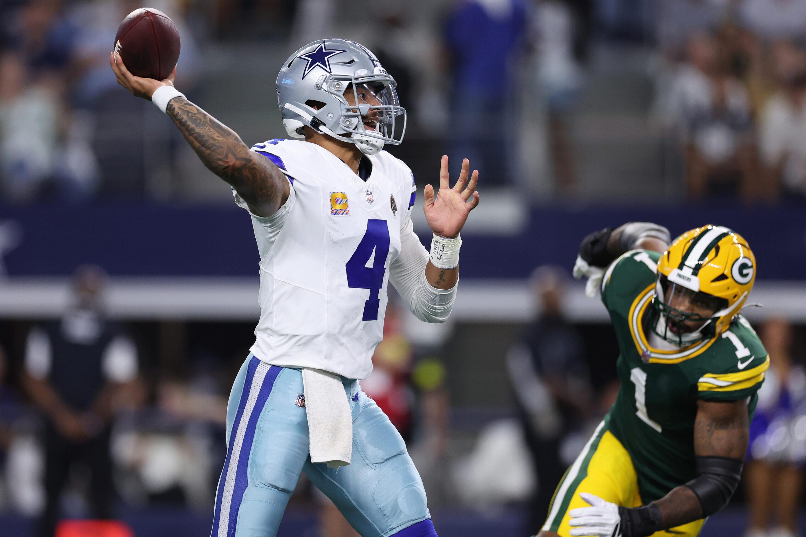 Dak Prescott passes as Micah Parsons pursues him during the first quarter of the Packers-Cowboys game