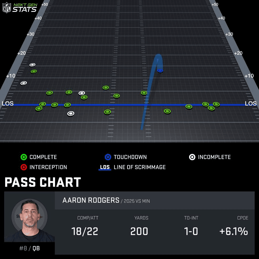 Rodgers didn’t exactly air it out against an aggressive Vikings defense. He finished with an impressive line in the traditional box score—completing 18 of 22 passes for 200 yards and a touchdown—but he averaged just 2.6 air yards per attempt and just 2.17 seconds per throw. It wasn’t an ambitious outing for the 41-year-old quarterback, and he showed little interest in holding on to the ball long enough to allow Brian Flores’s blitzes to get home.