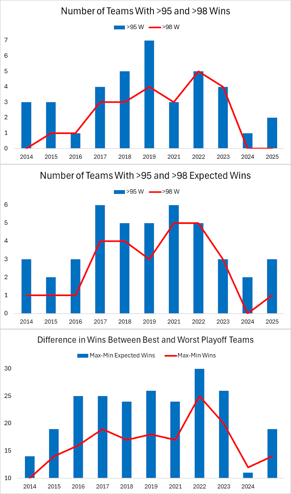“In 2024, there’s almost no such thing as a playoff upset,” I wrote heading into last year’s postseason. The same assertion applies to 2025. To update a few charts from that piece, based on the actual and expected regular-season records of the clubs in the playoff field: