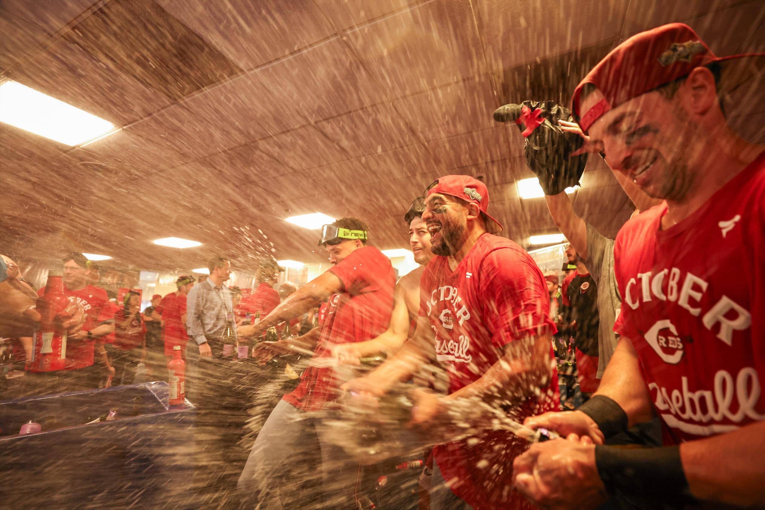 The Cincinnati Reds celebrate after a game against the Milwaukee Brewers on September 28