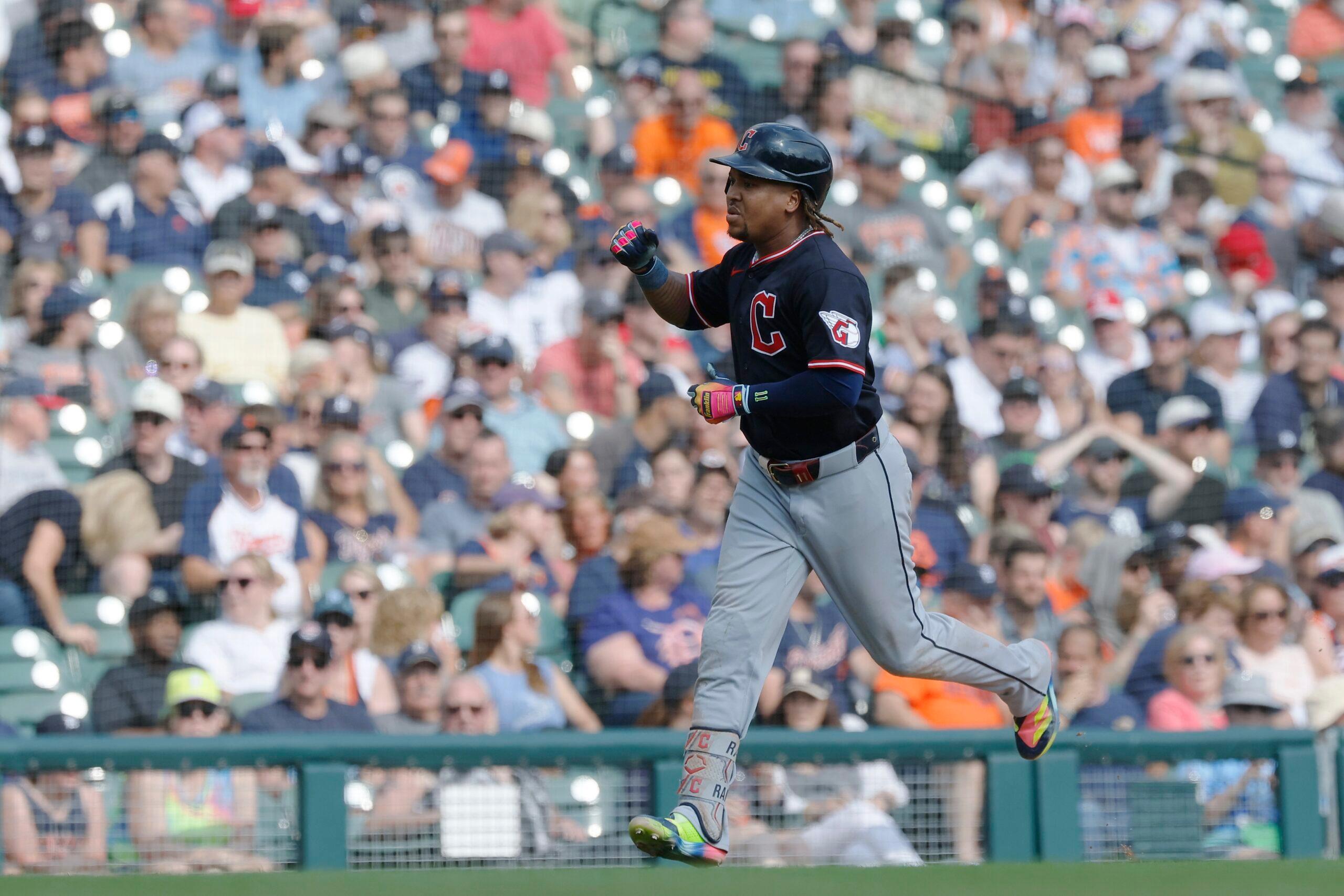 José Ramírez rounds the bases after hitting a two-run home run against the Detroit Tigers