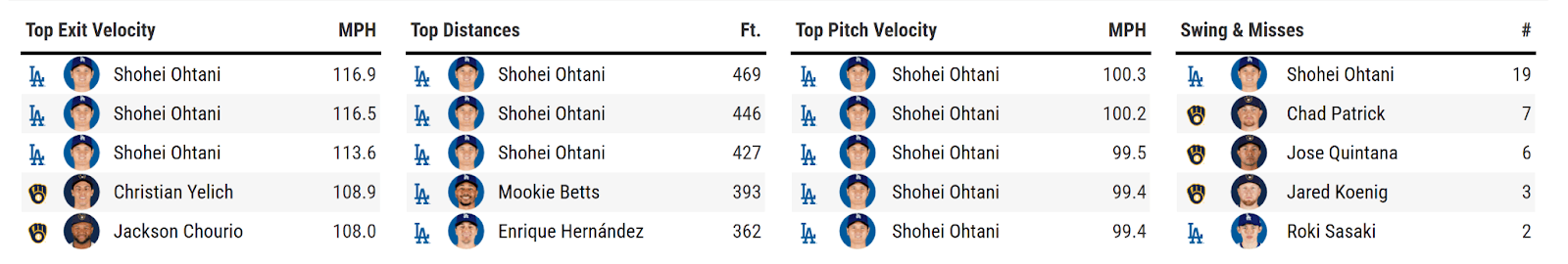 As calculated by Baseball Reference, Ohtani amassed .49 WPA/LI as a hitter and .22 WPA/LI as a pitcher, for a combined total of .71 situational wins. In other words, Ohtani was worth 71 percent of a win by himself—which, frankly, feels about right, given that he held the Brewers scoreless for two-thirds of the game and generated most of the Dodgers’ runs without any help from his teammates. Essentially, Ohtani sealed the series single-handedly. Granted, he used two hands: He threw right, batted left, and beat the Brewers from both sides.