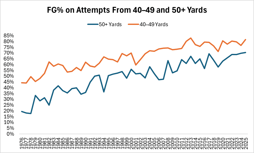 What’s going on is that kickers—even almost unknown ones—have gotten really good, thanks in part to their own talent and in part to new rules that allow for advance preparation of kicking footballs (a.k.a. K-balls). Consequently, as the AP put it earlier this month, “The 50-plus-yard field goals that once were a rarity in the NFL are now as routine as far shorter kicks a generation ago. The range for many kickers now exceeds 60 yards, changing late-game strategy in a major way.” A graph of field goal completion percentage from 40 to 49 yards and 50-plus yards over the past 50 seasons tells the same story.