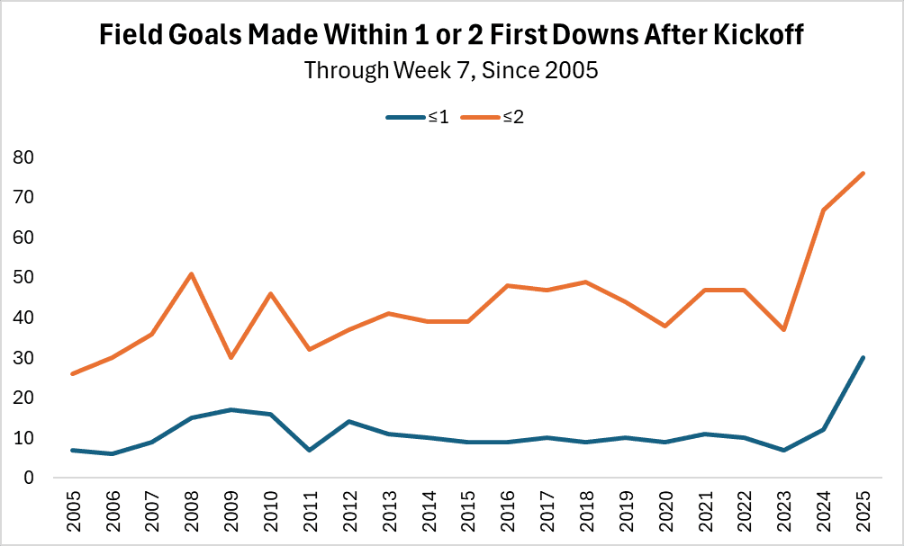 Lopez sent me some hard data on this. Through Week 7 of this season, there were 30 field goals made within one first down on a drive beginning after a kickoff, up from 12 last year and more than twice the highest number through the same point of any season since 2010. (The average total back to 2005 was only 10.4.) The number of field goals made within two first downs after a kickoff, 76, was also a new high, albeit only a modest uptick over last season, when the initial introduction of dynamic kickoffs caused a sharp spike.
