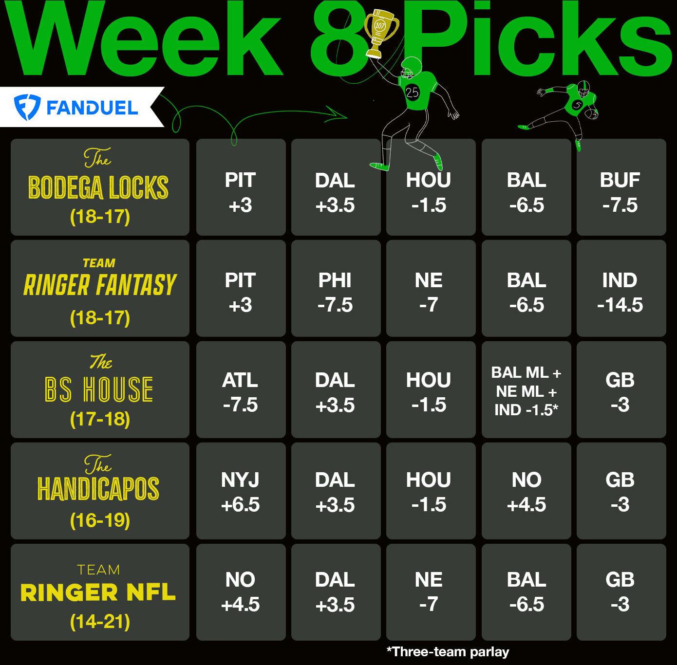This NFL season, Bill Simmons is inviting a collection of Ringer podcasts to enter the oddsmaker’s octagon with him—and only one will emerge victorious. For the entire regular season plus the playoffs (for a total of, you guessed it, 107 picks), The Bill Simmons Show will square off against The Ringer NFL Show, The Ringer Fantasy Football Show, and two teams from The Ringer Gambling Show. We’ll announce picks every Friday at theringer107.com and on our social platforms, and then we’ll publish an updated leaderboard on Tuesday. May the best (worst?) degenerate win. All odds via FanDuel sportsbook.