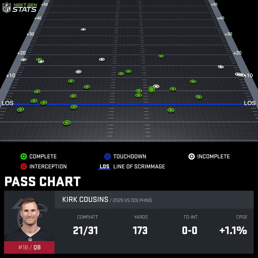 The 37-year-old passer has little mobility left and rarely tries to use it. He looked like he was just trying to survive Sunday’s game rather than trying to win it, knowing that the direct deposit would still hit in a few days either way. The prospect of Cousins getting traded to a QB-needy team was already a long shot before Sunday’s stinker—he’s due a $10 million roster bonus next offseason that will scare off teams—and now it feels like a nonstarter after seeing his work against the Dolphins. If Cousins is going to launch the final chapter of his career out of Atlanta, he may have to wait until 2026 for his chance.
