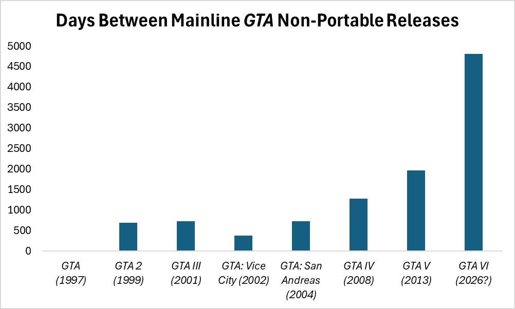 In GTA VI’s case, though, that protracted post-announcement wait is actually the home stretch of a much longer wait. This second graph displays the number of days between the releases of each mainline, non-portable GTA game, again taking GTA VI’s November 2026 target as gospel.