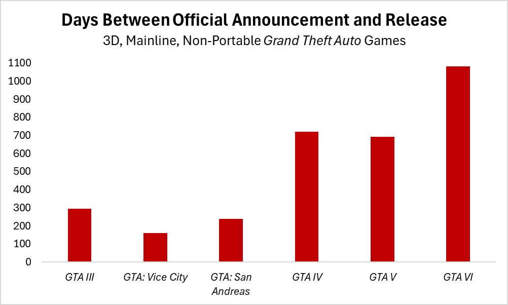 However, Rockstar is under a much more powerful microscope than most game-makers, especially where GTA is concerned. And the company’s cadence of releases has slowed dramatically of late. The chart below shows the number of days between the official announcement and release of each 3D, mainline, non-portable GTA game, assuming GTA VI sticks to its re-revised forecast. Naturally, fans are always aware that Rockstar is working on a sequel of some sort before Rockstar divulges details—a hacker published footage of GTA VI more than a year before the game’s grand unveiling—but this chart starts the countdown to debut at the point when Rockstar grudgingly lifted the lid on any or all of the following: title, location, plot details, screenshots, trailer.