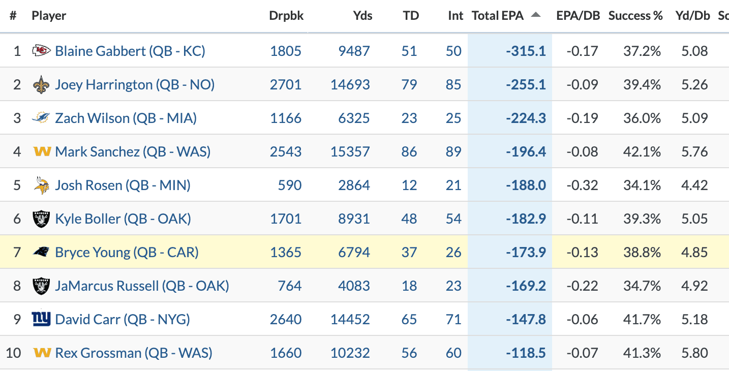 Bryce Young may not be on the Mount Rushmore of worst first-round quarterbacks ever, but he’s on the waitlist behind some of the league’s most infamous busts. If you narrow the scope to just first-overall picks, Young could be the worst of the century. He ranks dead last in career EPA behind even JaMarcus Russell.