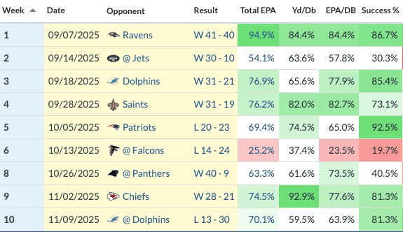 When Allen hasn’t turned the ball over this season, he’s been really good. And honestly, even some of his multi-turnover games have been solid. Here are his percentile ranks for a few key passing metrics by game, via TruMedia. The Atlanta game was Allen’s only real stinker.