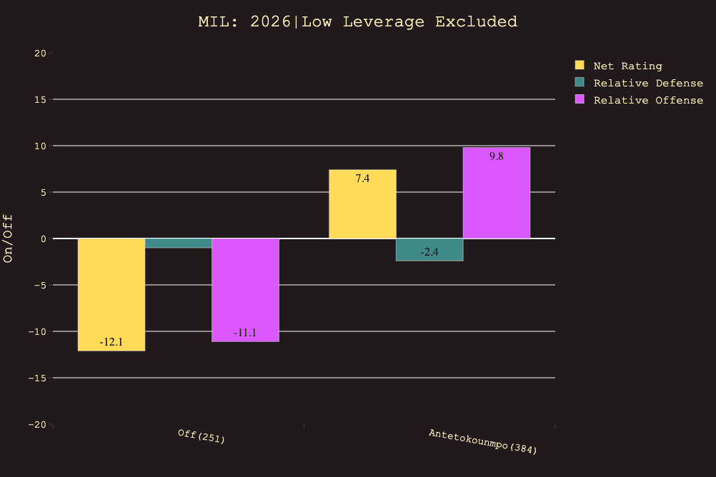 In every year since 2019, Milwaukee’s net rating has been above league average when Giannis is on the bench. That definitely isn’t the case this season. Check out this chart, courtesy of NBA Visuals: