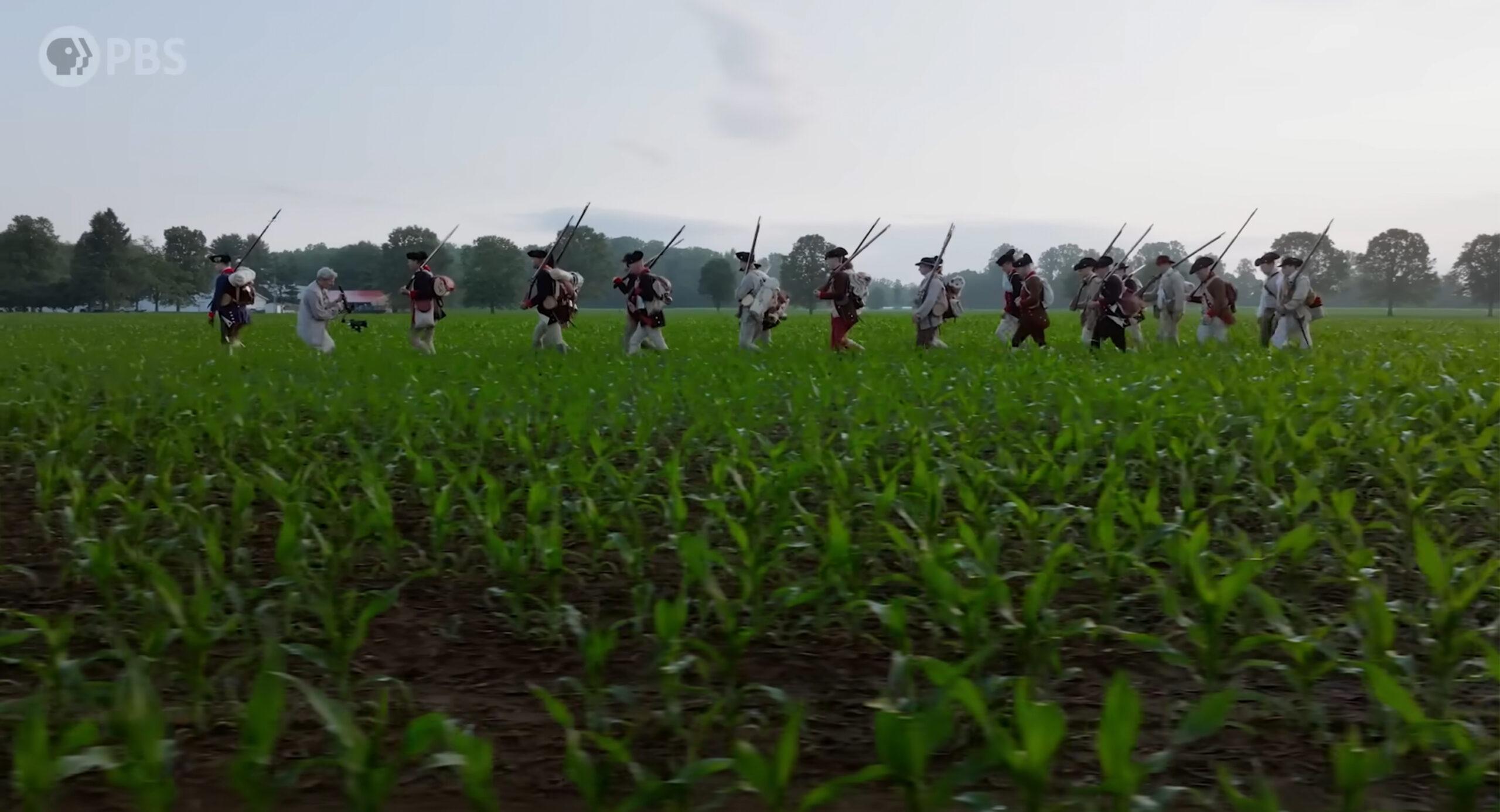 Instead of filming somebody reenacting a battle, we spend years and years filming dozens of reenactment groups—from French to Native American to British to militia to Continental Black, whatever troops they are. One of my favorite shots is just a Black hand holding a musket in a Continental uniform. That one shot instantly is signaling something about this story. To shoot these impressionistically, not looking at faces, but to see hands, see details, see boots in the mud, see aerial stuff from drones, you just get a sense of what it was like.