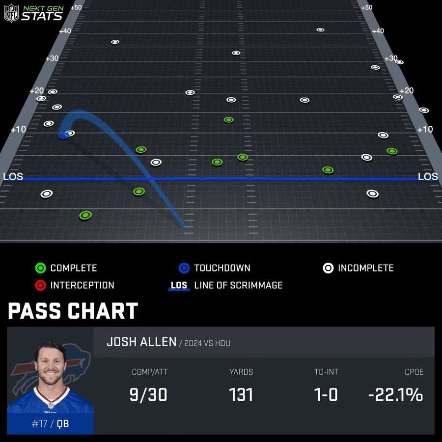 The Bills have played 93 regular-season games since the start of the 2020 season; their 23-20 loss to the Texans last season marked the lowest offensive success rate they had in any of those games (32.2 percent), by almost 5 percentage points. Buffalo’s limited receiving room couldn’t produce separation from a lockdown Houston secondary that day, and Josh Allen finished 9-of-30 for 131 yards. I’m not saying Allen will have a repeat of that performance, but the Texans are capable of shutting down Buffalo, as Houston’s coverage unit is one of the most dominant in the NFL. Without Dalton Kincaid, who’s ruled out for Thursday, which Bills pass catcher can strike fear into the Houston defense?