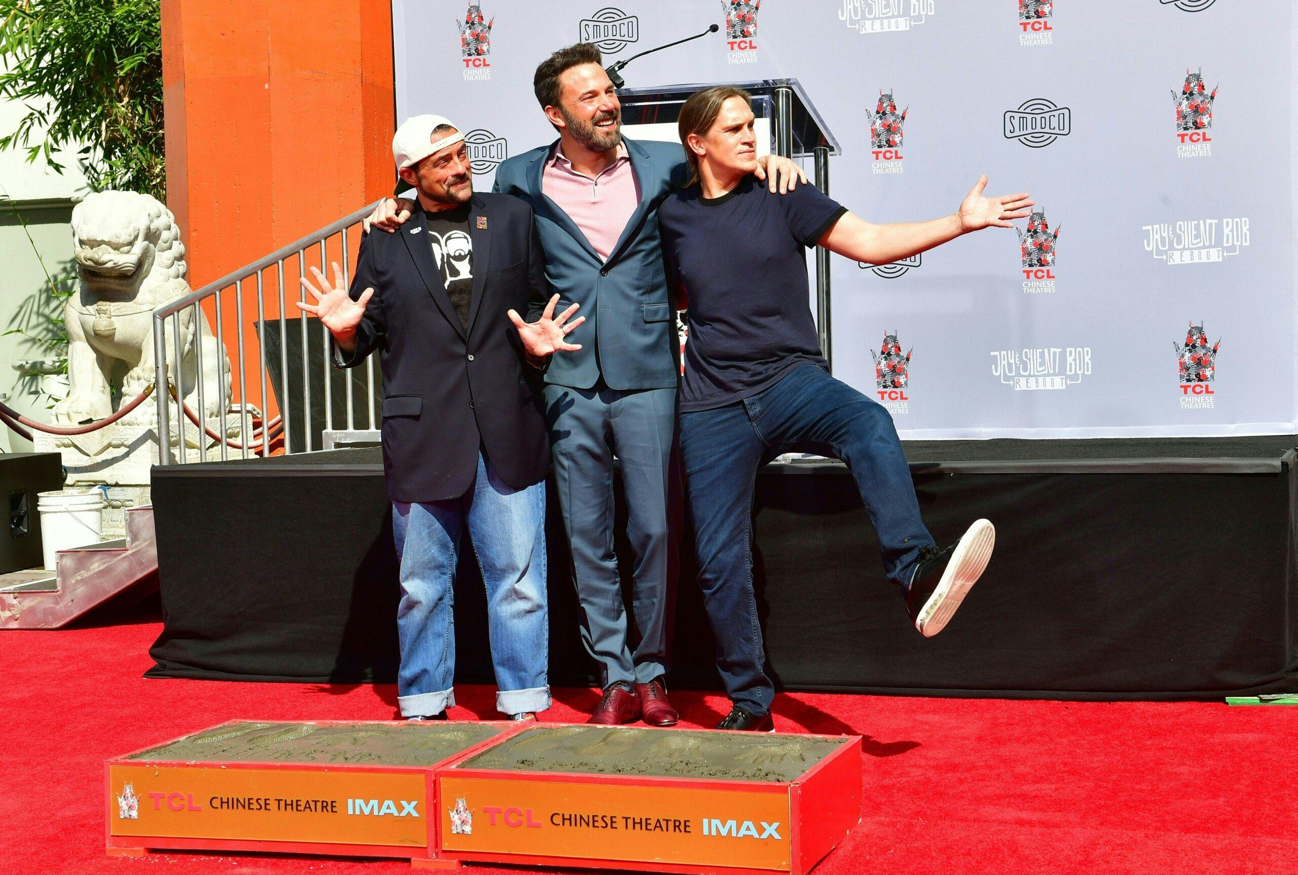 Kevin Smith and Jason Mewes pose with Ben Affleck at their hand and footprint ceremony in front of the TCL Chinese Theater on October 14, 2019