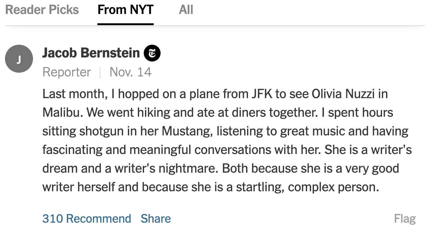 Sort of. For years, the thing with Nuzzi was that however frustrating her behavior might be, almost everyone agreed that she was a good writer. Yes, her vibe was chaotic. Yes, she seemed untrustworthy. "But the writing!" people said. "She's talented! The writing is good!" No one was going to confuse her with Joan Didion as a stylist, but her profiles were fun; they fizzed.