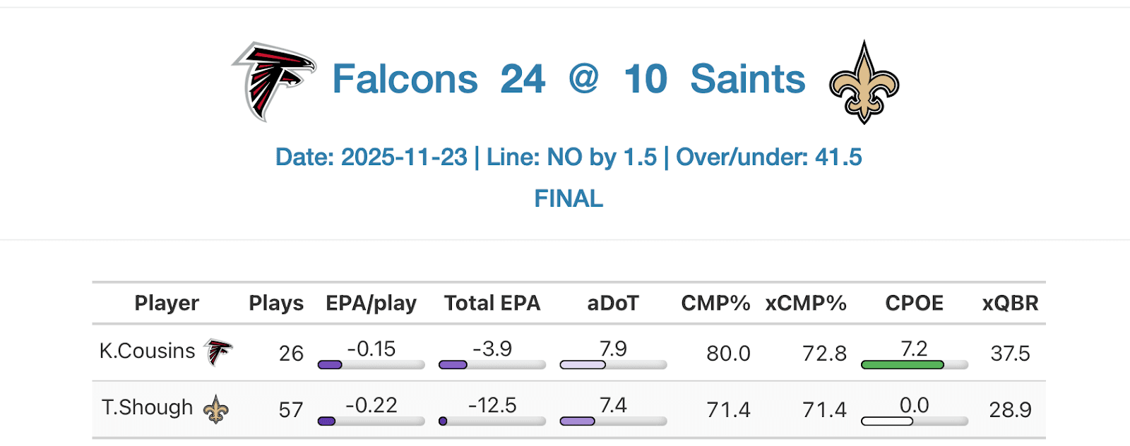 The Falcons tapped into some real “Nobody believes in us” energy with their wire-to-wire win against the Saints last week. With that being said, Kirk Cousins still threw a terrible pick-six and finished with a negative EPA per play. The Falcons won that game because New Orleans was absolutely diabolical in goal-scoring situations with red zone blunders and field goal misses.