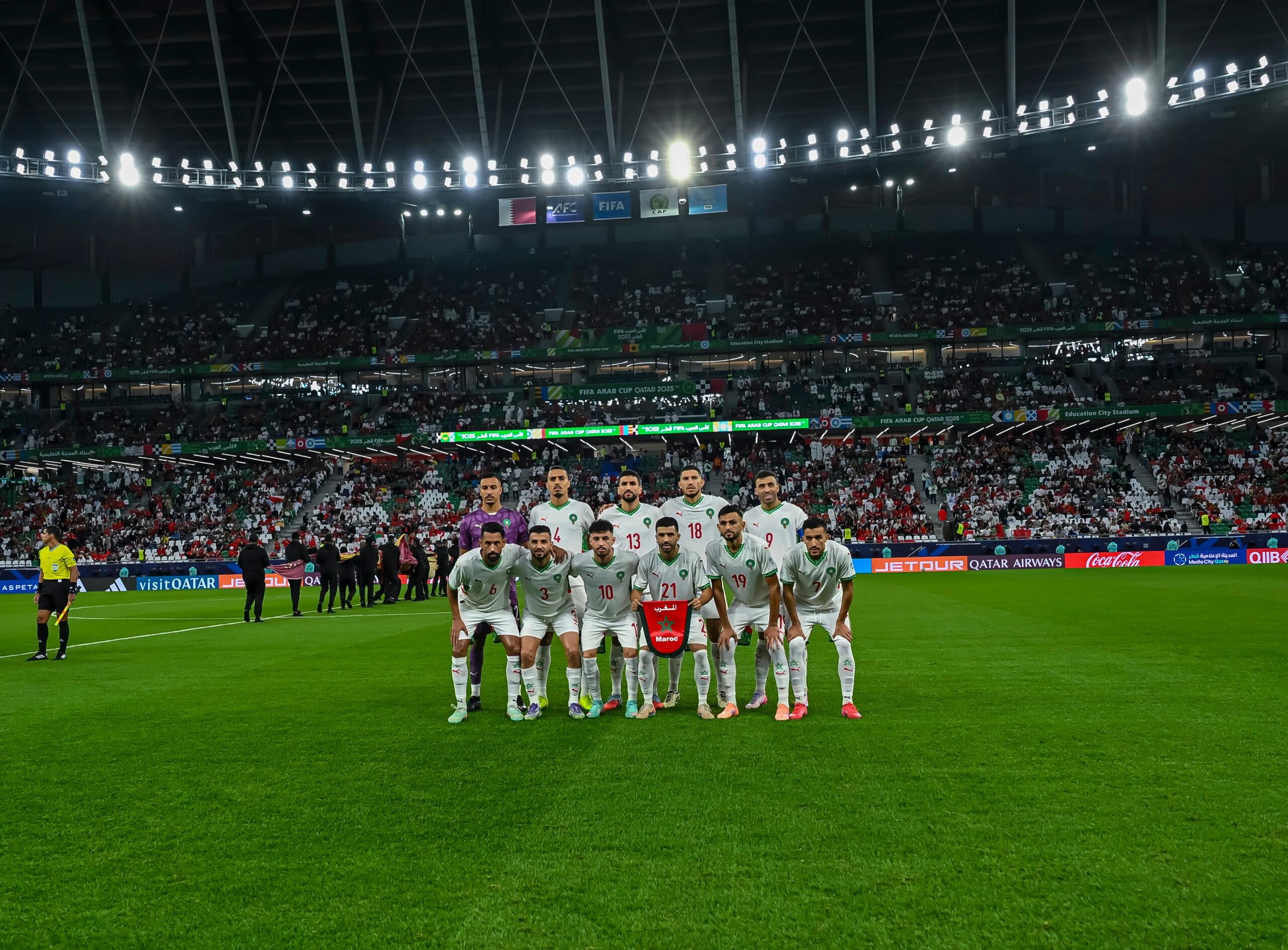 Morocco’s starting players of Morocco before the Group B FIFA Arab Cup 2025 match between Oman and Morocco