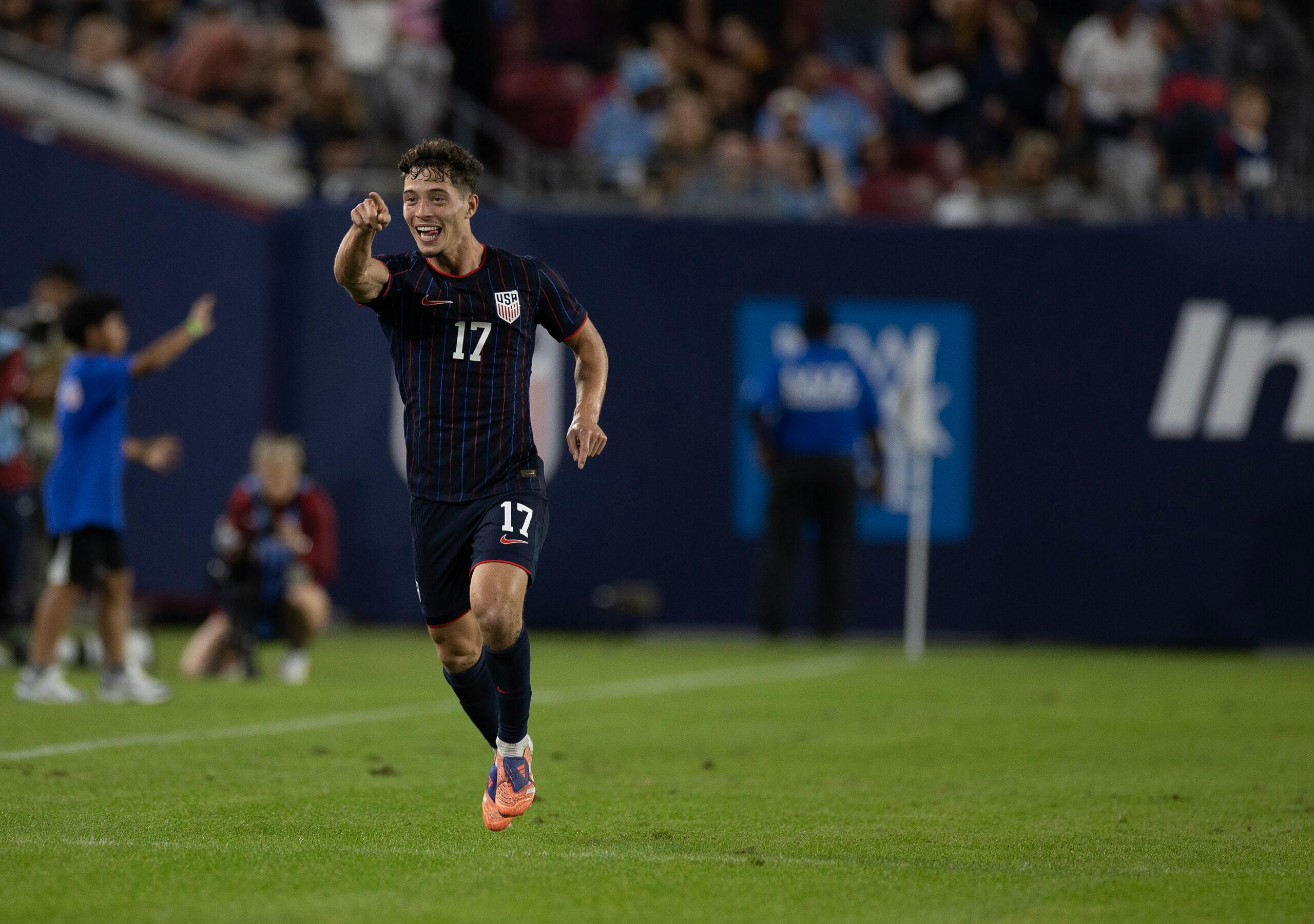 Sebastian Berhalter celebrates after scoring a goal during the game against Uruguay on November 18