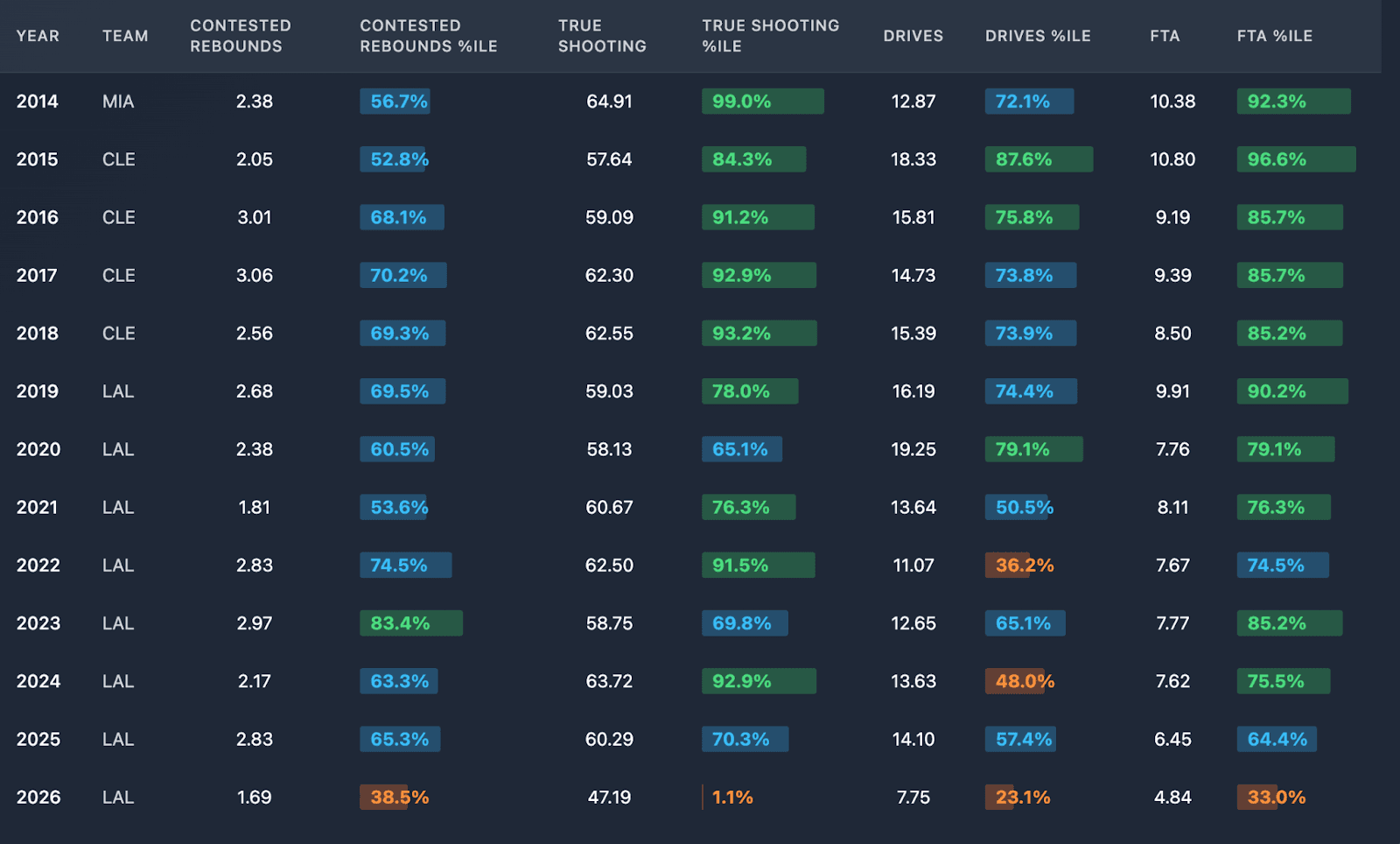 As seen above, James has much less on-ball responsibility than normal. But he’s yet to have a positive impact in other areas—be it steals, blocks, rebounds—while starting out as one of the least efficient scorers in the league. He isn’t attacking the basket, getting to the free throw line, or finishing in the paint like he used to.